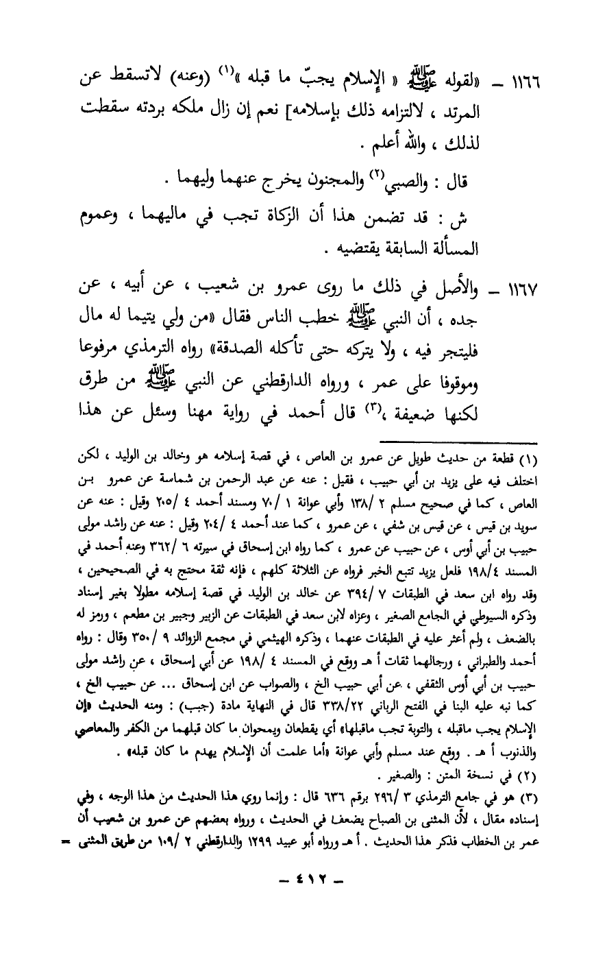 1167 - والأصل في ذلك ما روى عمرو بن شعيب، عن أبيه، عن جده، «أن النبي - صَلَّى اللَّهُ عَلَيْهِ وَسَلَّمَ - خطب الناس فقال: «من ولي يتيما له مال فليتجر فيه، ولا يتركه حتى تأكله الصدقة» رواه الترمذي مرفوعا وموقوفا على عمر، ورواه الدراقطني عن النبي - صَلَّى اللَّهُ عَلَيْهِ وَسَلَّمَ - من طرق لكنها ضعيفة، قال أحمد في رواية مهنا وسئل عن هذا