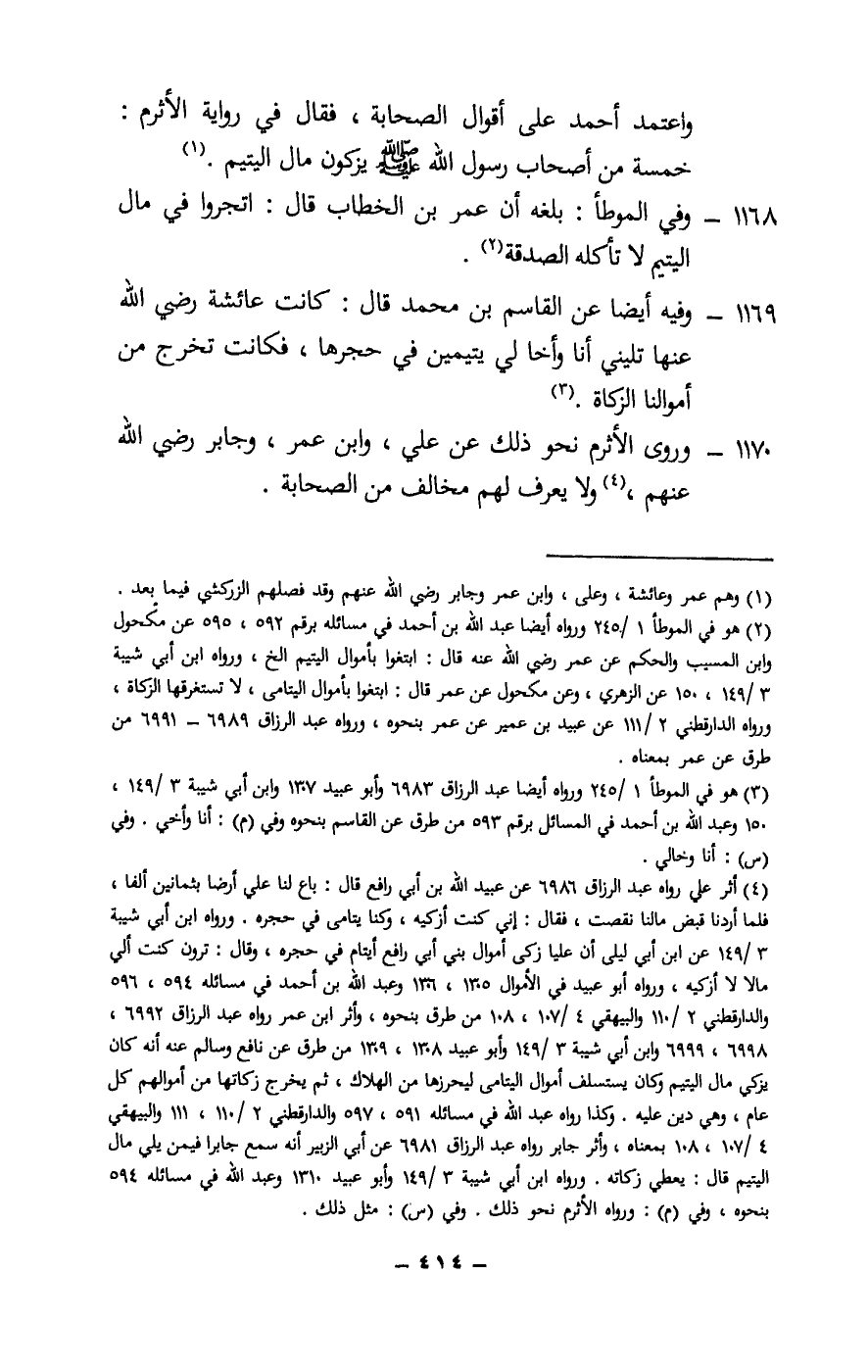 واعتمد أحمد على أقوال الصحابة، فقال في رواية الأثرم: خمسة من أصحاب رسول الله - صَلَّى اللَّهُ عَلَيْهِ وَسَلَّمَ - يزكون مال اليتيم.