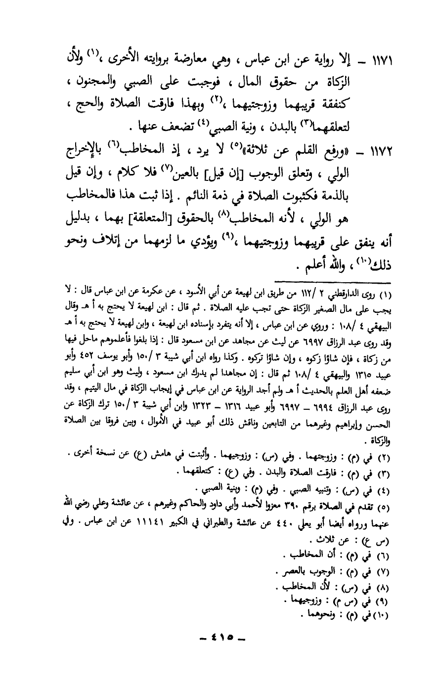 1172 - «ورفع القلم عن ثلاثة» لا يرد، إذ المخاطب بالإخراج الولي، وتعلق الوجوب [إن قيل] بالعين فلا كلام، وإن قيل بالذمة فكثبوت الصلاة في ذمة النائم. إذا ثبت هذا فالمخاطب هو الولي، لأنه المخاطب بالحقوق [المتعلقة] بهما، بدليل أنه ينفق على قريبهما وزوجتيهما، ويؤدي ما لزمهما من إتلاف ونحو ذلك، والله أعلم.