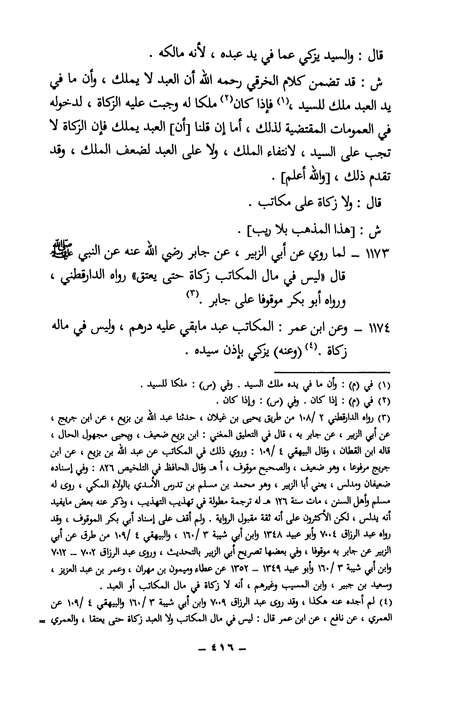 1173 - لما روي عن أبي الزبير، عن جابر - رَضِيَ اللَّهُ عَنْهُ - عن النبي - صَلَّى اللَّهُ عَلَيْهِ وَسَلَّمَ - قال: «ليس في مال المكاتب زكاة حتى يعتق» رواه الدارقطني، ورواه أبو بكر موقوفا على جابر.