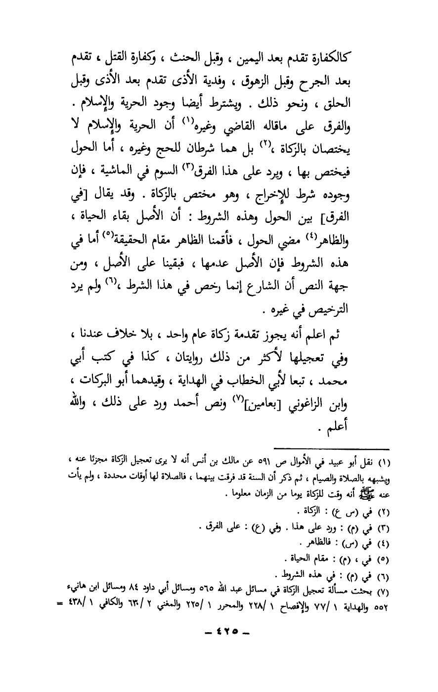 كالكفارة تقدم بعد اليمين، وقبل الحنث، وكفارة القتل، تقدم بعد الجرح وقبل الزهوق، وفدية الأذى تقدم بعد الأذى وقبل الحلق، ونحو ذلك. ويشترط أيضا وجود الحرية والإسلام. والفرق على ما قاله القاضي وغيره أن الحرية والإسلام لا يختصان بالزكاة، بل هما شرطان للحج وغيره، أما الحول فيختص بها، ويرد على هذا الفرق السوم في الماشية، فإن وجوده شرط للإخراج، وهو مختص بالزكاة. وقد يقال: [في الفرق] بين الحول وهذه الشروط: أن الأصل بقاء الحياة، والظاهر مضي الحول، فأقمنا الظاهر مقام الحقيقة أما في هذه الشروط فإن الأصل عدمها، فبقينا على الأصل، ومن جهة النص أن الشارع إنما رخص في هذا الشرط، ولم يرد الترخيص في غيره.