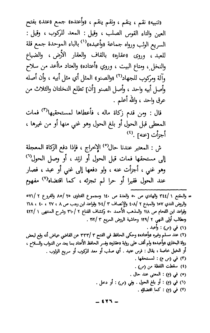 «تنبيه» : نقم ينقم، ونقم ينقم، «وأعتده» جمع «عتد» بفتح العين والتاء القوس الصلب، وقيل: المعد للركوب، وقيل: السريع الوثب ورواه جماعة «وأعبده» بالباء الموحدة جمع قلة للعبد، وروى «عقاره» بالقاف والعقار الأرض، والضياع والنخل، ومتاع البيت، وروي «أعتاده» والعتاد ما أعد من سلاح وآلة ومركوب للجهاد «والصنو» المثل أي مثل أبيه، وأن أصله وأصل أبيه واحد، وأصل الصنو [أن] تطلع النخلتان والثلاث من عرق واحد، والله أعلم.