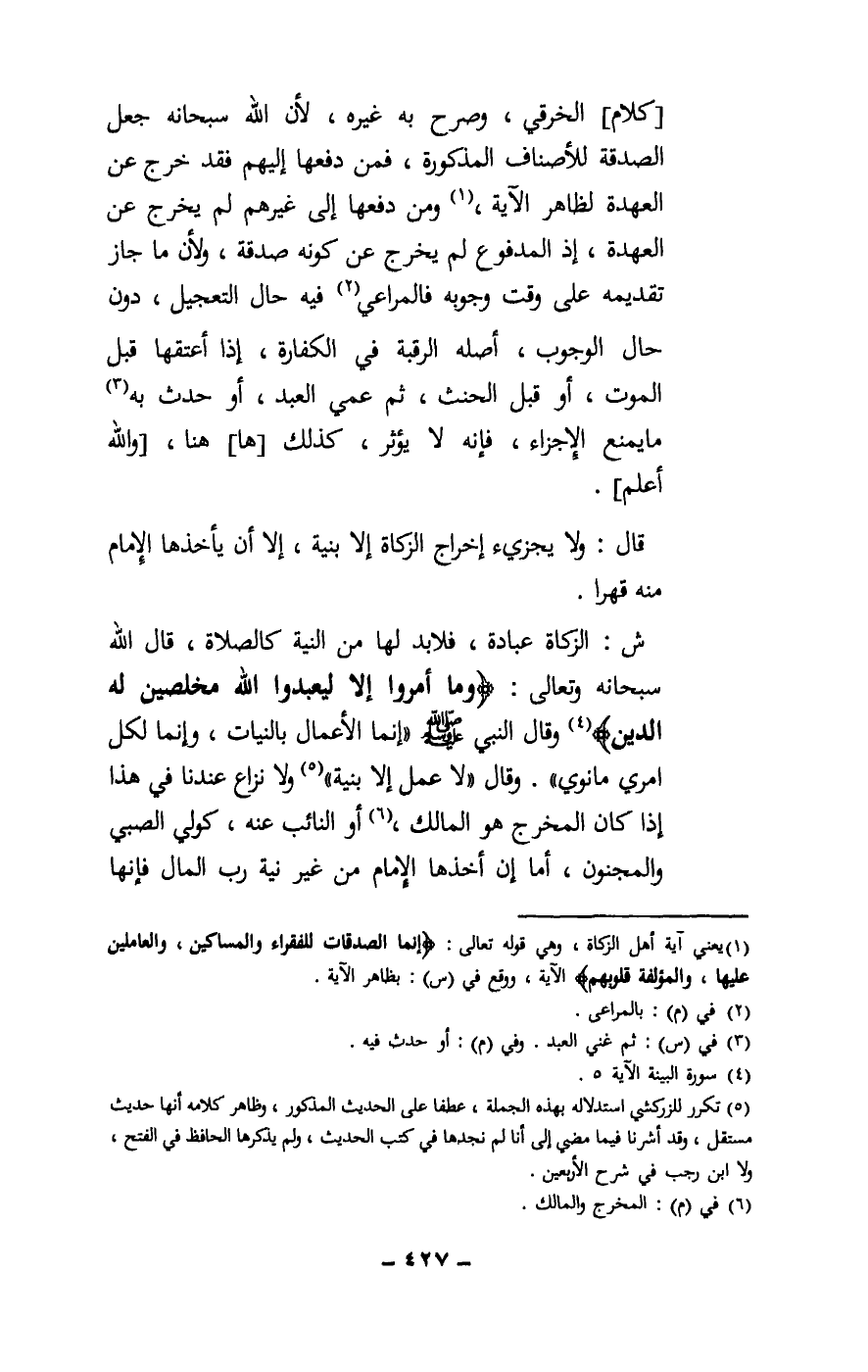ش: الزكاة عبادة، فلا بد لها من النية كالصلاة، قال الله سبحانه وتعالى: {وَمَا أُمِرُوا إِلَّا لِيَعْبُدُوا اللَّهَ مُخْلِصِينَ لَهُ الدِّينَ} [البينة: 5] وقال النبي - صَلَّى اللَّهُ عَلَيْهِ وَسَلَّمَ -: «إنما الأعمال بالنيات، وإنما لكل امرئ ما نوى» . وقال: «لا عمل إلا بنية» ولا نزاع عندنا في هذا إذا كان المخرج هو المالك، أو النائب عنه، كولي الصبي والمجنون، أما إن أخذها الإمام من غير نية رب المال فإنها