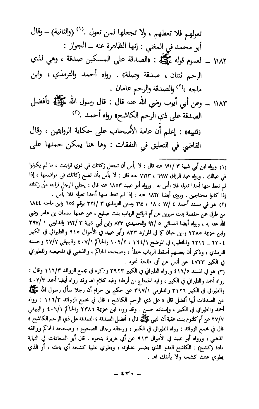 1183 - وعن أبي أيوب - رَضِيَ اللَّهُ عَنْهُ - قال: قال رسول الله - صَلَّى اللَّهُ عَلَيْهِ وَسَلَّمَ -: «أفضل الصدقة على ذي الرحم الكاشح» رواه أحمد.
