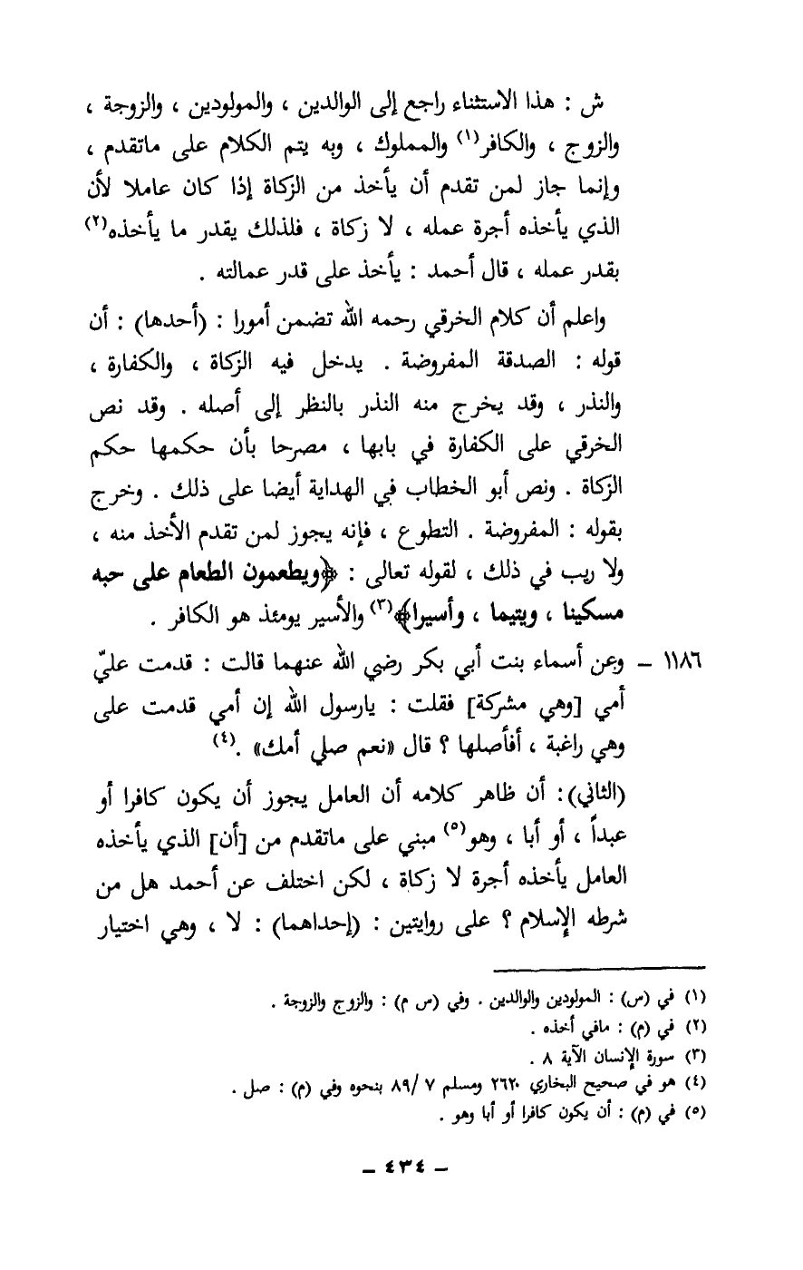 واعلم أن كلام الخرقي - رَحِمَهُ اللَّهُ - تضمن أمورا: (أحدها) : أن قوله: الصدقة المفروضة. يدخل فيه الزكاة، والكفارة، والنذر، وقد يخرج منه النذر بالنظر إلى أصله. وقد نص الخرقي على الكفارة في بابها، مصرحا بأن حكمها حكم الزكاة. ونص أبو الخطاب في الهداية أيضا على ذلك. وخرج بقوله: المفروضة. التطوع، فإنه يجوز لمن تقدم الأخذ منه، ولا ريب في ذلك، لِقَوْلِهِ تَعَالَى: {وَيُطْعِمُونَ الطَّعَامَ عَلَى حُبِّهِ مِسْكِينًا وَيَتِيمًا وَأَسِيرًا} [الإنسان: 8] والأسير يومئذ هو الكافر.