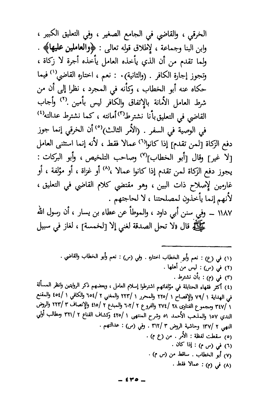 الخرقي، والقاضي في الجامع الصغير، وفي التعليق الكبير، وابن البنا وجماعة، لإطلاق قَوْله تَعَالَى: {وَالْعَامِلِينَ عَلَيْهَا} [التوبة: 60] . ولما تقدم من أن الذي يأخذه العامل يأخذه أجرة لا زكاة، وتجوز إجارة الكافر. (والثانية) : نعم، اختاره القاضي فيما حكاه عنه أبو الخطاب، وكأنه في المجرد، نظرا إلى أن من شرط العامل الأمانة بالاتفاق والكافر ليس بأمين. وأجاب القاضي في التعليق بأنا نشترط أمانته، كما نشترط عدالته في الوصية في السفر. (الأمر الثالث) أن الخرقي إنما جوز دفع الزكاة [لمن تقدم] إذا كانوا عمالا فقط، لأنه إنما استثنى العامل [لا غير] وقال: [أبو الخطاب] وصاحب التلخيص، وأبو البركات: يجوز دفع الزكاة لمن تقدم إذا كانوا عمالا، أو غزاة، أو مؤلفة، أو غارمين لإصلاح ذات البين، وهو مقتضى كلام القاضي في التعليق، لأنهم إنما يأخذون لمصلحتنا، لا لحاجتهم.