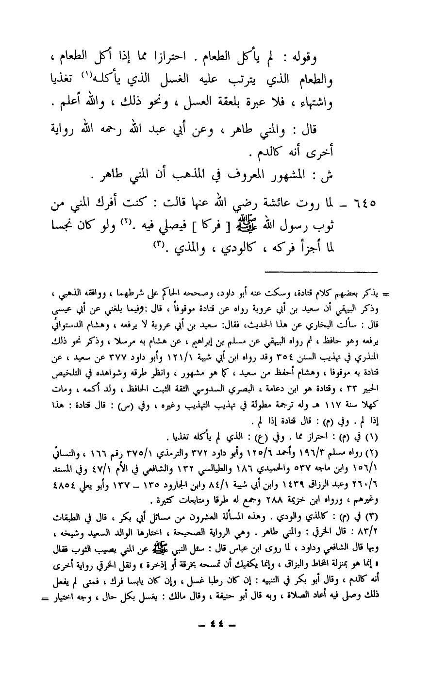 645 - لما «روت عائشة - رَضِيَ اللَّهُ عَنْهَا -، قالت: كنت أفرك المني من ثوب رسول الله - صَلَّى اللَّهُ عَلَيْهِ وَسَلَّمَ -[فركا] فيصلي فيه» ، ولو كان نجسا لما أجزأ فركه، كالودي، والمذي.