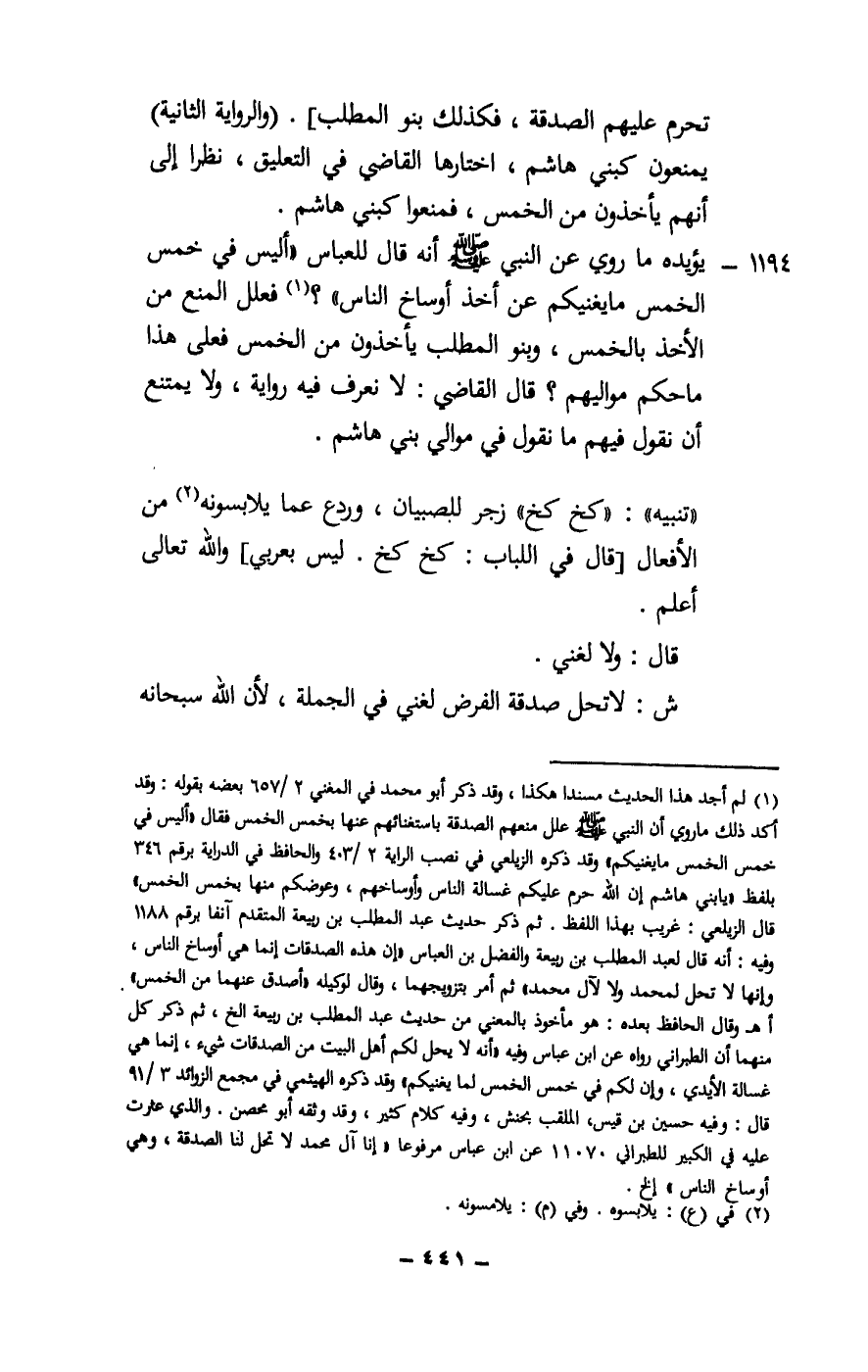 1194 - يؤيده ما روي عن النبي - صَلَّى اللَّهُ عَلَيْهِ وَسَلَّمَ - أنه قال للعباس: «أليس في خمس الخمس ما يغنيكم عن أخذ أوساخ الناس» ؟ فعلل المنع من الأخذ بالخمس، وبنو المطلب يأخذون من الخمس فعلى هذا ما حكم مواليهم؟ قال القاضي: لا نعرف فيه رواية، ولا يمتنع أن نقول فيهم ما نقول في موالي بني هاشم.