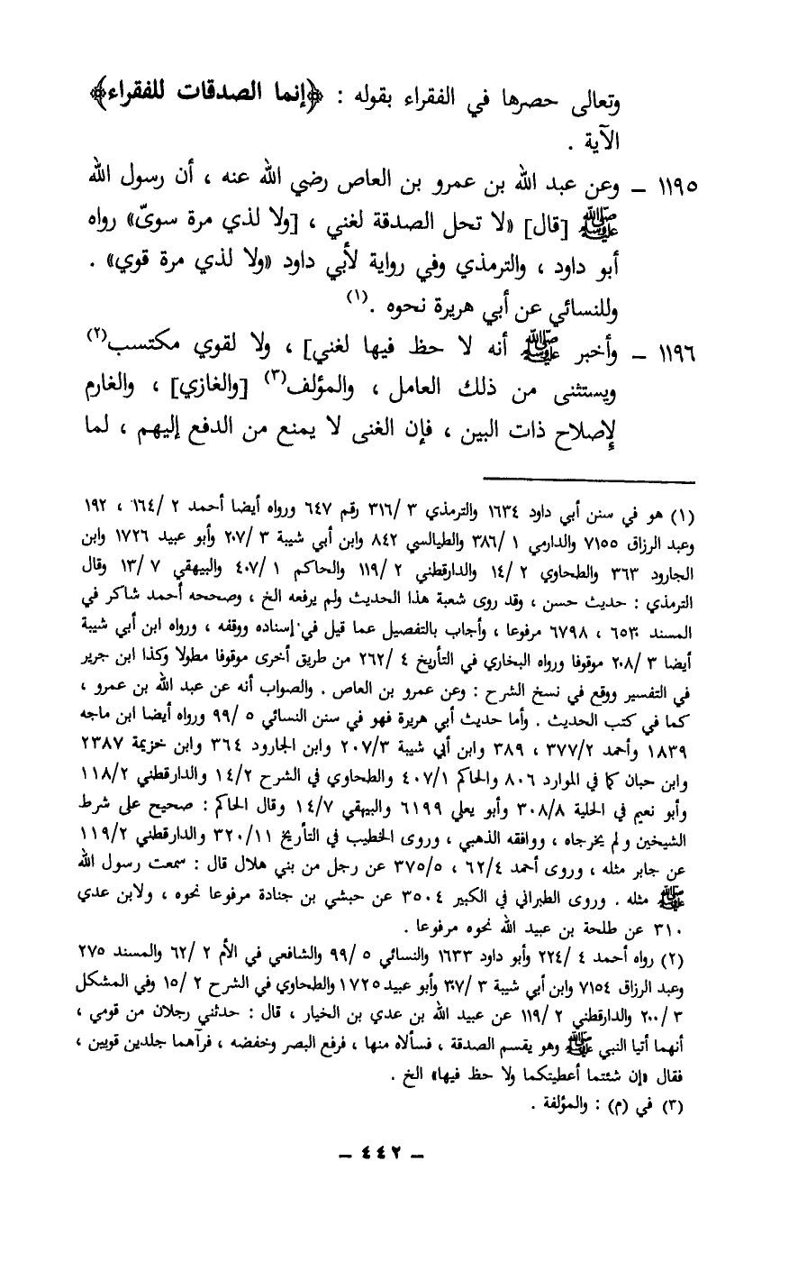 1195 - وعن عبد الله بن عمرو بن العاص - رَضِيَ اللَّهُ عَنْهُ -، أن رسول الله - صَلَّى اللَّهُ عَلَيْهِ وَسَلَّمَ -[قال] : «لا تحل الصدقة لغني، [ولا لذي مرة سوي» رواه أبو داود، والترمذي وفي رواية لأبي داود: «ولا لذي مرة قوي» . وللنسائي عن أبي هريرة نحوه.