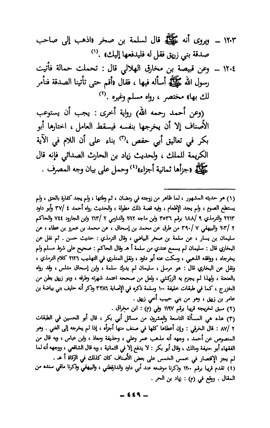 1203 - ويروى «أنه - صَلَّى اللَّهُ عَلَيْهِ وَسَلَّمَ - قال لسلمة بن صخر: «اذهب إلى صاحب صدقة بني زريق فقل له فليدفعها إليك» .