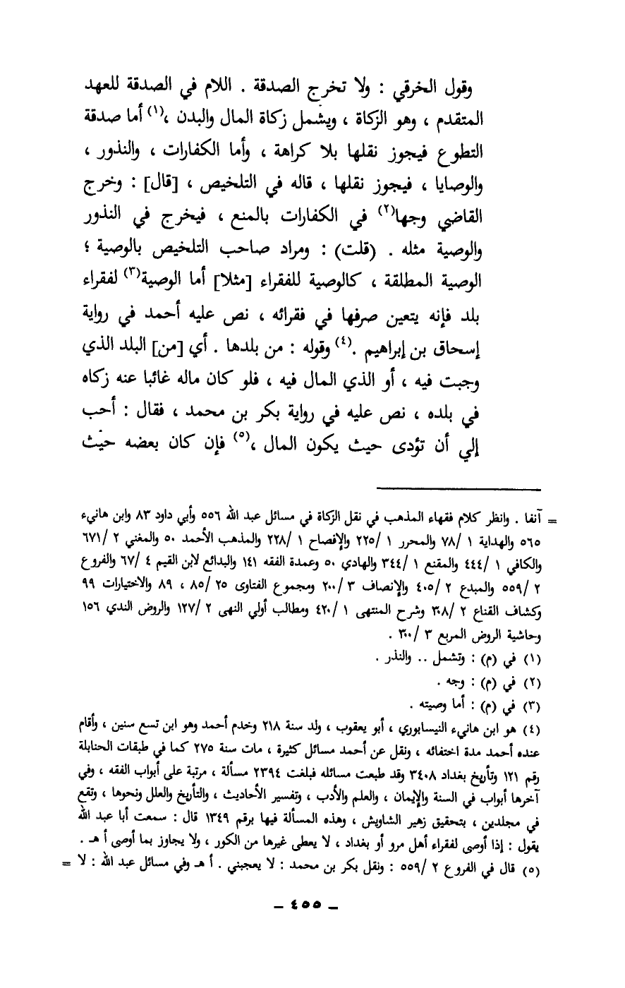 وقول الخرقي: ولا تخرج الصدقة. اللام في الصدقة للعهد المتقدم، وهو الزكاة، ويشمل زكاة المال والبدن، أما صدقة التطوع فيجوز نقلها بلا كراهة، وأما الكفارات، والنذور، والوصايا، فيجوز نقلها، قاله في التلخيص، [قال] : وخرج القاضي وجها في الكفارات بالمنع، فيخرج في النذور والوصية مثله. (قلت) : ومراد صاحب التلخيص بالوصية؛ الوصية المطلقة، كالوصية للفقراء [مثلا] أما الوصية لفقراء بلد فإنه يتعين صرفها في فقرائه، نص عليه أحمد في رواية إسحاق بن إبراهيم. وقوله: من بلدها. أي [من] البلد الذي وجبت فيه، أو الذي المال فيه، فلو كان ماله غائبا عنه زكاه في بلده، نص عليه في رواية بكر بن محمد، فقال: أحب إلي أن تؤدي حيث يكون المال، فإن كان بعضه حيث
