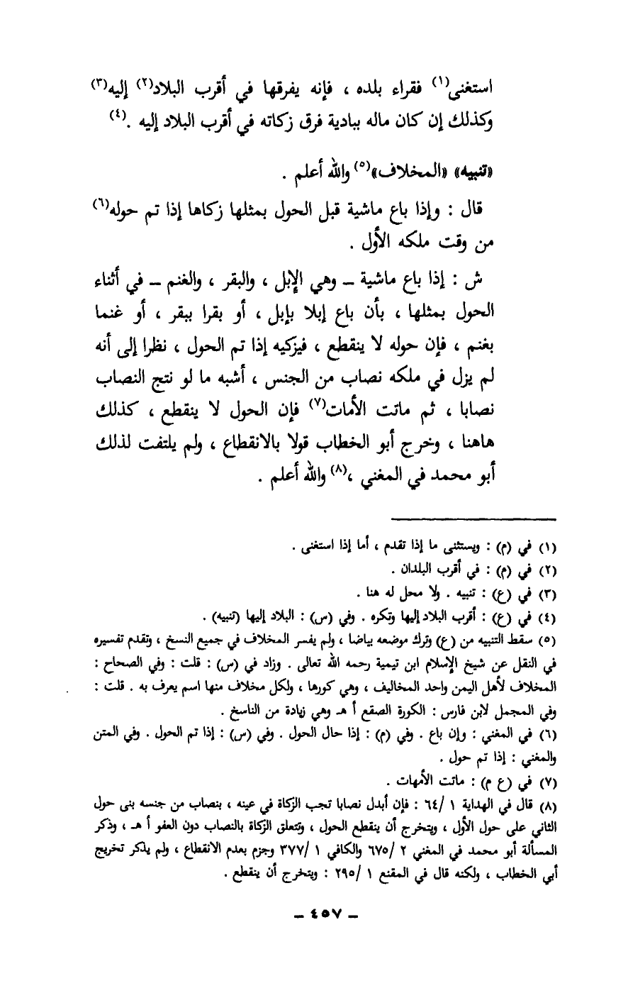 ش: إذا باع ماشية - وهي الإبل، والبقر، والغنم - في أثناء الحول بمثلها، بأن باع إبلا بإبل، أو بقرا ببقر، أو غنما بغنم، فإن حوله لا ينقطع، فيزكيه إذا تم الحول، نظرا إلى أنه لم يزل في ملكه نصاب من الجنس، أشبه ما لو نتج النصاب نصابا، ثم ماتت الأمات فإن الحول لا ينقطع، كذلك هاهنا، وخرج أبو الخطاب قولا بالانقطاع، ولم يلتفت لذلك أبو محمد في المغني، والله أعلم.