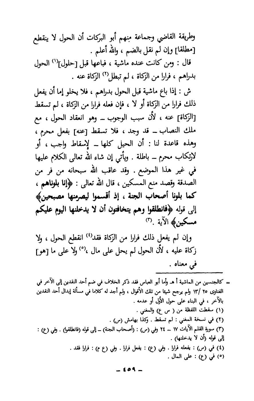 ش: إذا باع ماشية قبل الحول بدراهم، فلا يخلو إما أن يفعل ذلك فرارا من الزكاة أو لا، فإن فعله فرارا من الزكاة، لم تسقط [الزكاة] عنه، لأن سبب الوجوب - وهو انعقاد الحول، مع ملك النصاب - قد وجد، فلا تسقط [عنه] بفعل محرم، وهذه قاعدة لنا: أن الحيل كلها - لإسقاط واجب، أو لارتكاب محرم - باطلة. ويأتي إن شاء الله تعالى الكلام عليها في غير هذا الموضع. وقد عاقب الله سبحانه من فر من الصدقة وقصد منع المسكين، قال الله تعالى: {إِنَّا بَلَوْنَاهُمْ كَمَا بَلَوْنَا أَصْحَابَ الْجَنَّةِ إِذْ أَقْسَمُوا لَيَصْرِمُنَّهَا مُصْبِحِينَ} [القلم: 17] إلى قوله: {فَانْطَلَقُوا وَهُمْ يَتَخَافَتُونَ} [القلم: 23] {أَنْ لَا يَدْخُلَنَّهَا الْيَوْمَ عَلَيْكُمْ مِسْكِينٌ} [القلم: 24] الآية.