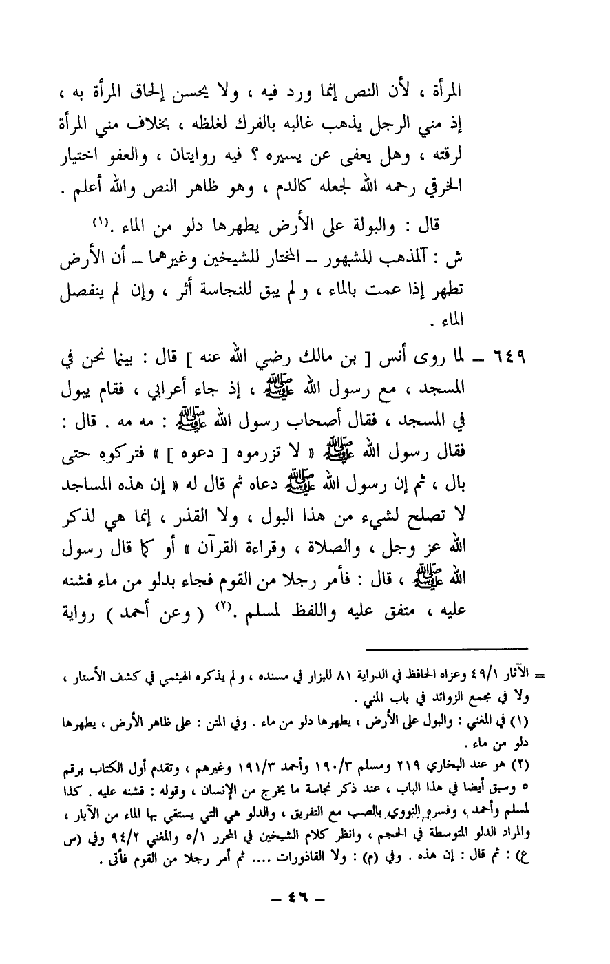 649 - لما «روى أنس [بن مالك - رَضِيَ اللَّهُ عَنْهُ -] ، قال: بينما نحن في المسجد، مع رسول الله - صَلَّى اللَّهُ عَلَيْهِ وَسَلَّمَ - إذ جاء أعرابي، فقام يبول في المسجد، فقال أصحاب رسول الله - صَلَّى اللَّهُ عَلَيْهِ وَسَلَّمَ -: مه مه. قال: فقال رسول الله - صَلَّى اللَّهُ عَلَيْهِ وَسَلَّمَ -: «لا تزرموه [دعوه] » فتركوه حتى بال، ثم إن رسول الله - صَلَّى اللَّهُ عَلَيْهِ وَسَلَّمَ - دعاه، ثم قال له: «إن هذه المساجد لا تصلح لشيء من هذا البول، ولا القذر، إنما هي لذكر الله عز وجل، والصلاة، وقراءة القرآن» أو كما قال رسول الله - صَلَّى اللَّهُ عَلَيْهِ وَسَلَّمَ -، قال: فأمر رجلا من القوم فجاء بدلو من ماء فشنه عليه» ، متفق عليه، واللفظ لمسلم. (وعن أحمد) رواية