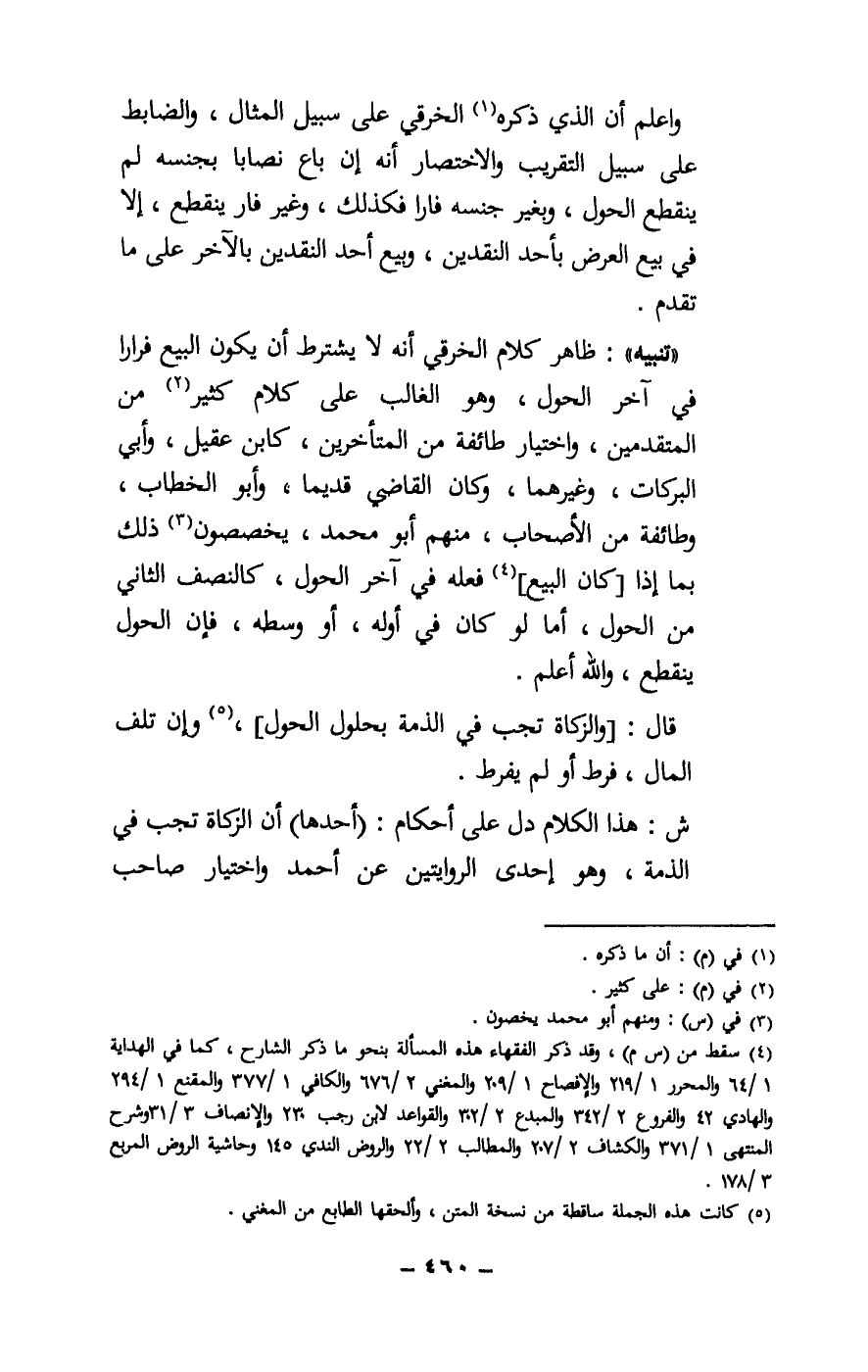 «تنبيه» : ظاهر كلام الخرقي أنه يشترط أن يكون البيع فرارا في آخر الحول، وهو الغالب على كلام كثير من المتقدمين، واختيار طائفة من المتأخرين، كابن عقيل، وأبي البركات، وغيرهما، وكان القاضي قديما، وأبو الخطاب، وطائفة من الأصحاب، ومنهم أبو محمد، يخصصون ذلك بما إذا [كان البيع] فعله في آخر الحول، كالنصف الثاني من الحول، أما لو كان في أوله، أو وسطه، فإن الحول ينقطع، والله أعلم.
