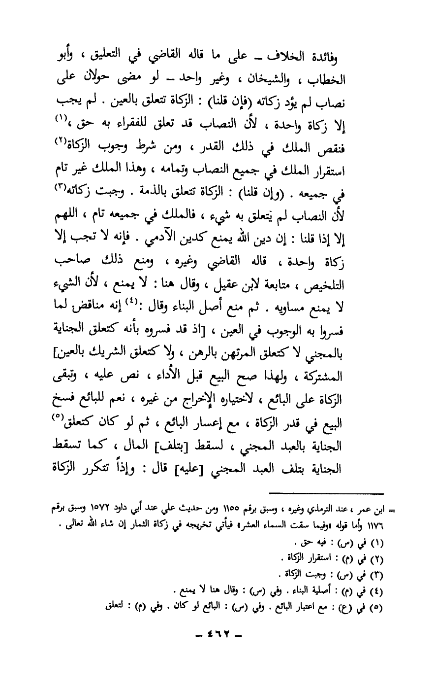 وفائدة الخلاف - على ما قاله القاضي في التعليق، وأبو الخطاب، والشيخان، وغير واحد - لو مضى حولان على نصاب لم يؤد زكاته (فإن قلنا) : الزكاة تتعلق بالعين. لم يجب إلا زكاة واحدة، لأن النصاب قد تعلق للفقراء به حق، فنقص الملك في ذلك القدر، ومن شرط وجوب الزكاة استقرار الملك في جميع النصاب وتمامه، وهذا الملك غير تام في جميعه. (وإن قلنا) : الزكاة تتعلق بالذمة. وجبت زكاته لأن النصاب لم يتعلق به شيء، فالملك في جميعه تام، اللهم إلا إذا قلنا: إن دين الله يمنع كدين الآدمي. فإنه لا تجب إلا زكاة واحدة، قاله القاضي وغيره، ومنع ذلك صاحب التلخيص، متابعة لابن عقيل، وقال هنا: لا يمنع، لأن الشيء لا يمنع مساويه. ثم منع أصل البناء وقال: إنه مناقض لما فسروا به الوجوب في العين، [إذ قد فسروه بأنه كتعلق الجناية بالمجني لا كتعلق المرتهن بالرهن، ولا كتعلق الشريك بالعين] المشتركة، ولهذا صح البيع قبل الأداء، نص عليه، وتبقى الزكاة على البائع، لاختياره الإخراج من غيره، نعم للبائع فسخ البيع في قدر الزكاة، مع إعسار البائع، ثم لو كان كتعلق الجناية بالعبد المجني، لسقط [بتلف] المال، كما تسقط الجناية بتلف العبد المجني [عليه] قال: وإذًا تتكرر الزكاة