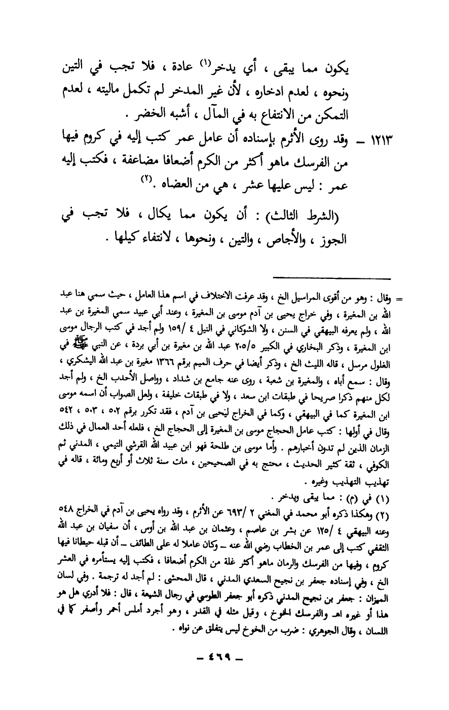 1213 - وقد روى الأثرم بإسناده أن عامل عمر كتب إليه في كروم فيها من الفرسك ما هو أكثر من الكرم أضعافا مضاعفة، فكتب إليه عمر: ليس عليها عشر، هي من العضاه.