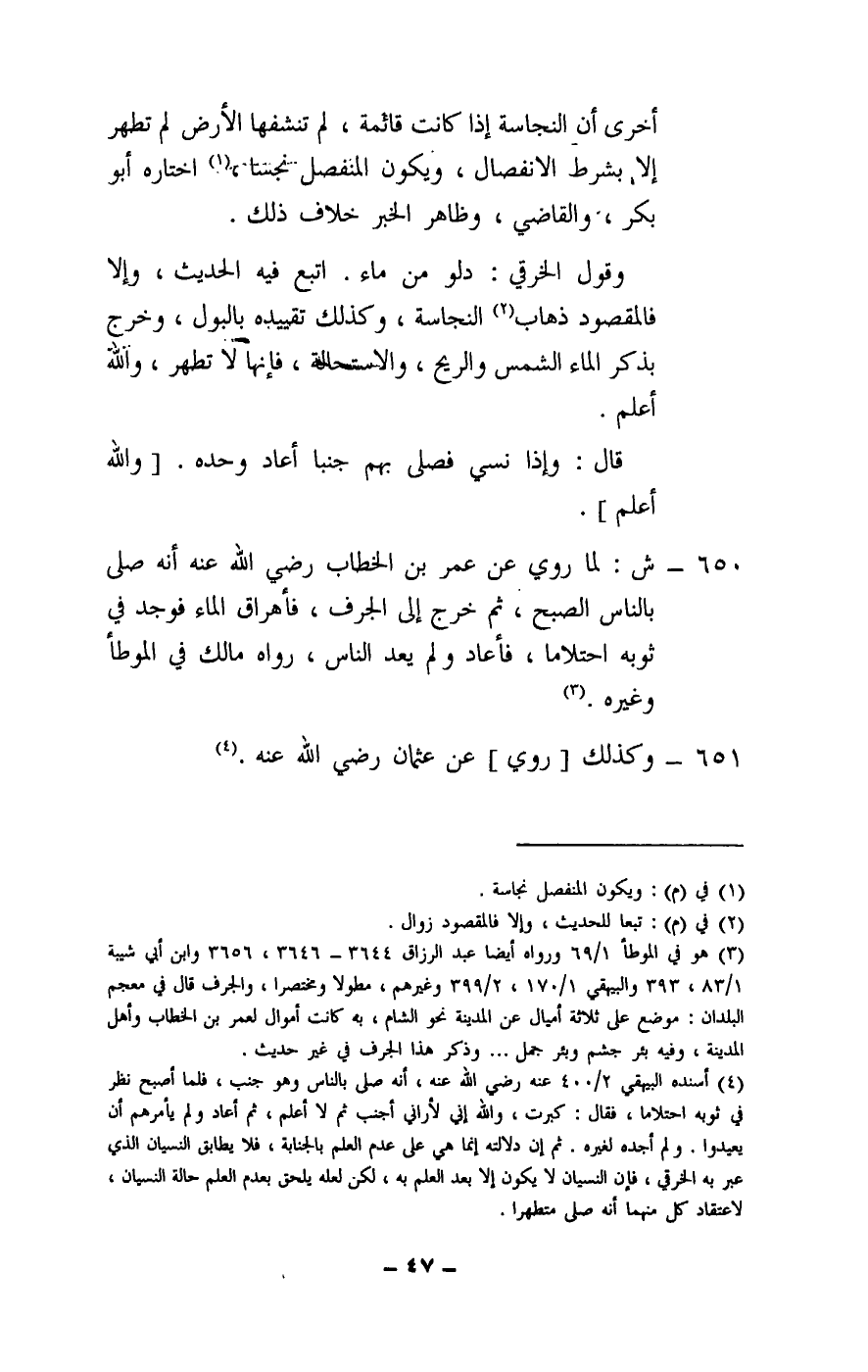 650 - ش: لما روي عن عمر بن الخطاب - رَضِيَ اللَّهُ عَنْهُ - أنه صلى بالناس الصبح، ثم خرج إلى الجرف، فأهراق الماء فوجد في ثوبه احتلاما، فأعاد ولم يعد الناس، رواه مالك في الموطأ وغيره.