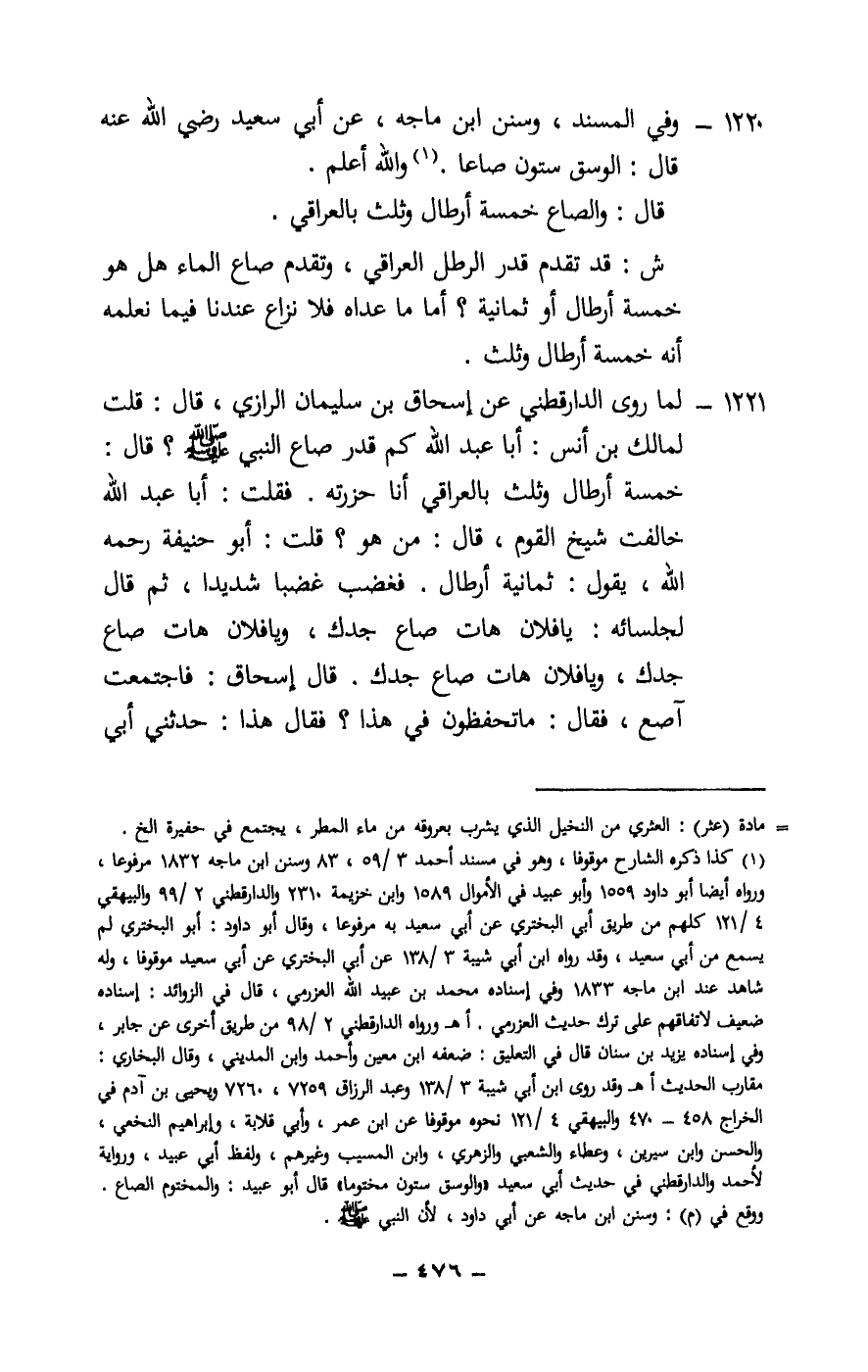 1221 - لما روى الدارقطني عن إسحاق بن سليمان الرازي، قال: قلت لمالك بن أنس: أبا عبد الله كم قدر صاع النبي - صَلَّى اللَّهُ عَلَيْهِ وَسَلَّمَ -؟ قال: خمسة أرطال وثلث بالعراقي أنا حزرته. فقلت: أبا عبد الله خالفت شيخ القوم، قال: من هو؟ قلت: أبو حنيفة - رَحِمَهُ اللَّهُ - يقول: ثمانية أرطال. فغضب غضبا شديدا، ثم قال لجلسائه: يا فلان هات صاع جدك، ويا فلان هات صاع جدك، ويا فلان هات صاع جدك. قال إسحاق: فاجتمعت آصع، فقال: ما تحفظون في هذا؟ فقال هذا: حدثني أبي