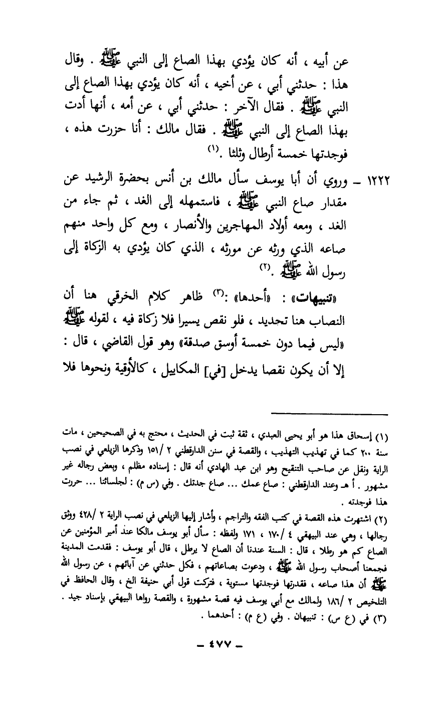 1222 - وروي أن أبا يوسف سأل مالك بن أنس بحضرة الرشيد عن مقدار صاع النبي - صَلَّى اللَّهُ عَلَيْهِ وَسَلَّمَ - فاستمهله إلى الغد، ثم جاء من الغد، ومعه أولاد المهاجرين والأنصار، ومع كل واحد منهم صاعه الذي ورثه عن مورثه، الذي كان يؤدي به الزكاة إلى رسول الله - صَلَّى اللَّهُ عَلَيْهِ وَسَلَّمَ -.