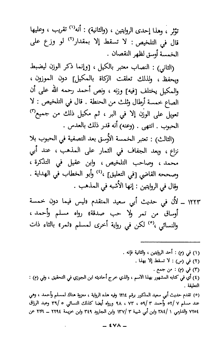 1223 - لأن في حديث أبي سعيد المتقدم «ليس فيما دون خمسة أوساق من تمر ولا حب صدقة» رواه مسلم وأحمد، والنسائي، لكن في رواية أخرى لمسلم «ثمر» بالثاء ذات