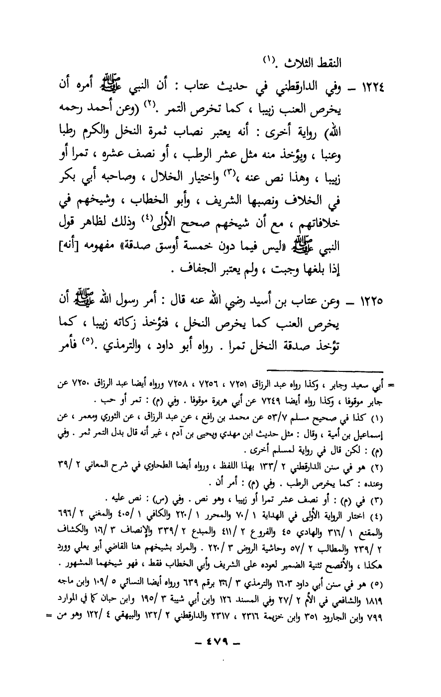 1224 - وفي الدارقطني في «حديث عتاب: أن النبي - صَلَّى اللَّهُ عَلَيْهِ وَسَلَّمَ - أمره أن يخرص العنب زبيبا، كما تخرص التمر» . (وعن أحمد - رَحِمَهُ اللَّهُ -) رواية أخرى: أنه يعتبر نصاب ثمرة النخل والكرم رطبا وعنبا، ويؤخذ منه مثل عشر الرطب، أو نصف عشره، تمرا أو زبيبا، وهذا نص عنه، واختيار الخلال، وصاحبه أبي بكر في الخلاف ونصبها الشريف، وأبو الخطاب، وشيخهم في خلافاتهم، مع أن شيخهم صحح الأولى وذلك لظاهر قول النبي - صَلَّى اللَّهُ عَلَيْهِ وَسَلَّمَ -: «ليس فيما دون خمسة أوسق صدقة» مفهومه [أنه] إذا بلغها وجبت، ولم يعتبر الجفاف.