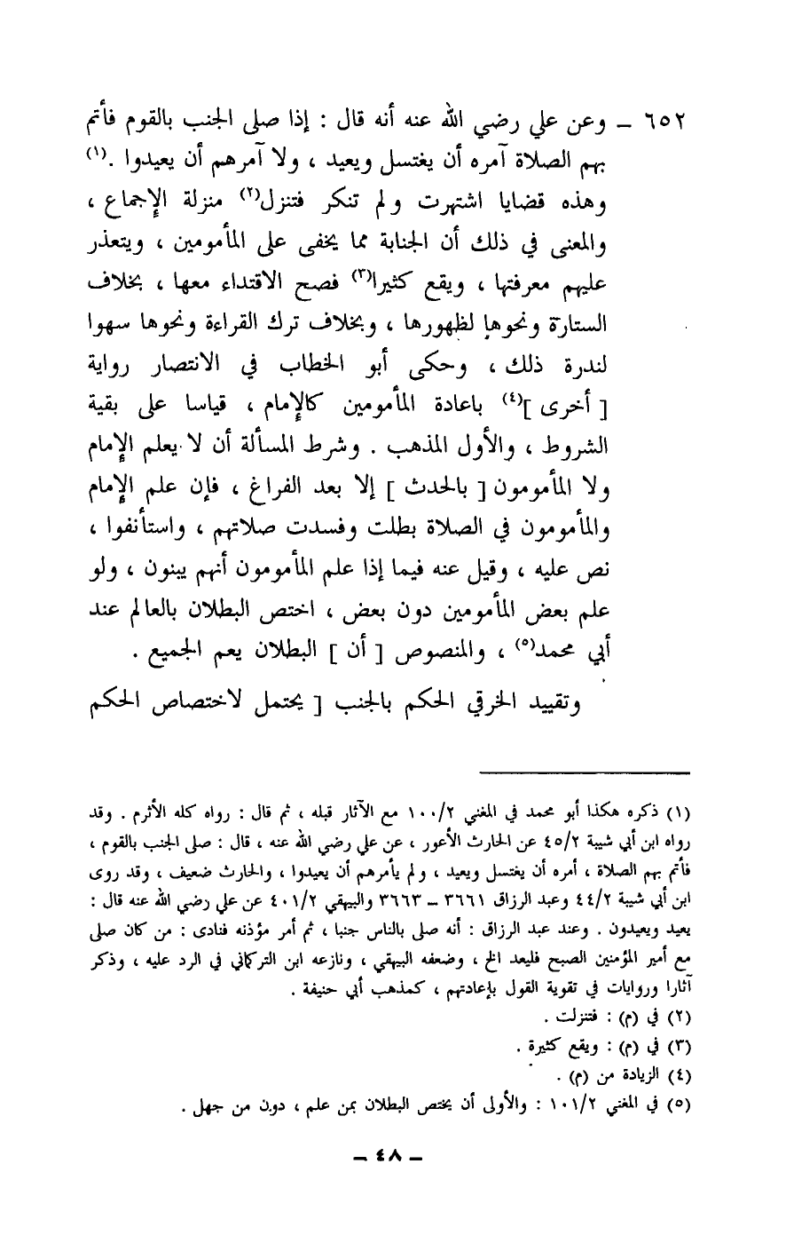 652 - وعن علي - رَضِيَ اللَّهُ عَنْهُ -، أنه قال: إذا صلى الجنب بالقوم فأتم بهم الصلاة آمره أن يغتسل ويعيد، ولا آمرهم أن يعيدوا. وهذه قضايا اشتهرت ولم تنكر فتنزل منزلة الإجماع، والمعنى في ذلك أن الجنابة مما يخفى على المأمومين، ويتعذر عليهم معرفتها، ويقع كثيرا فصح الاقتداء معها، بخلاف الستارة ونحوها لظهورها، وبخلاف ترك القراءة ونحوها سهوا لندرة ذلك، وحكى أبو الخطاب في الانتصار رواية [أخرى] بإعادة المأمومين كالإمام، قياسا على بقية الشروط، والأول المذهب. وشرط المسألة أن لا يعلم الإمام ولا المأمومون [بالحدث] إلا بعد الفراغ، فإن علم الإمام والمأمومون في الصلاة بطلت وفسدت صلاتهم، واستأنفوا، نص عليه، وقيل عنه فيما إذا علم المأمومون أنهم يبنون، ولو علم بعض المأمومين دون بعض، اختص البطلان بالعالم عند أبي محمد، والمنصوص [أن] البطلان يعم الجميع.
