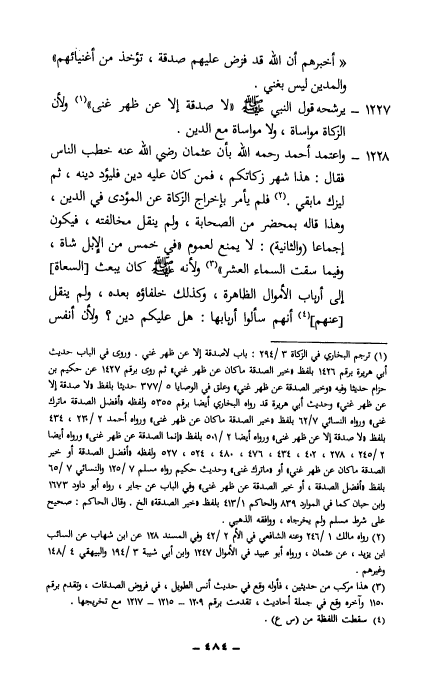 1227 - يرشحه قول النبي - صَلَّى اللَّهُ عَلَيْهِ وَسَلَّمَ -: «لا صدقة إلا عن ظهر غنى» ولأن الزكاة مواساة، ولا مواساة مع الدين.