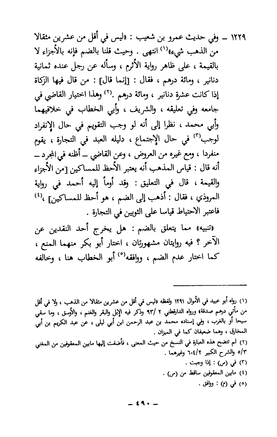 1229 - وفي حديث عمرو بن شعيب: «ليس في أقل من عشرين مثقالا من الذهب شيء» انتهى. وحيث قلنا بالضم فإنه بالأجزاء لا بالقيمة، على ظاهر رواية الأثرم، وسأله عن رجل عنده ثمانية دنانير، ومائة درهم، فقال: [إنما قال] : من قال فيها الزكاة إذا كانت عشرة دنانير، ومائة درهم. وهذا اختيار القاضي في جامعه وفي تعليقه، والشريف، وأبي الخطاب في خلافيهما وأبي محمد، نظرا إلى أنه لو وجب التقويم في حال الانفراد لوجب في حال الاجتماع، دليله العبد في التجارة، يقوم منفردا، ومع غيره من العروض، وعن القاضي - أظنه في المجرد - أنه قال: قياس المذهب أنه يعتبر الأحظ للمساكين [من الأجزاء والقيمة، قال في التعليق: وقد أومأ إليه أحمد في رواية المروذي، فقال: أذهب إلى الضم، هو أحظ للمساكين] ، فاعتبر الاحتياط قياسا على الثوبين في التجارة.