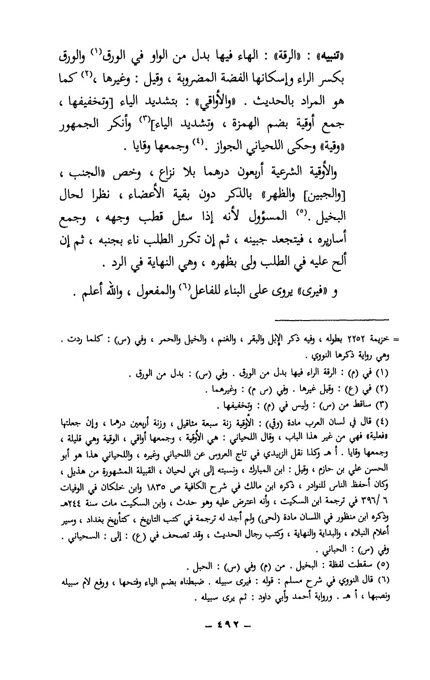 «تنبيه» : «الرقة» : الهاء فيها بدل من الواو في الورق؛ والورق بكسر الراء وإسكانها الفضة المضروبة، وقيل: وغيرها، كما هو المراد بالحديث. «والأواقي» : بتشديد الياء [وتخفيفها، جمع أوقية بضم الهمزة، وتشديد الياء] ، وأنكر الجمهور «وقية» وحكى اللحياني الجواز. وجمعها وقايا.