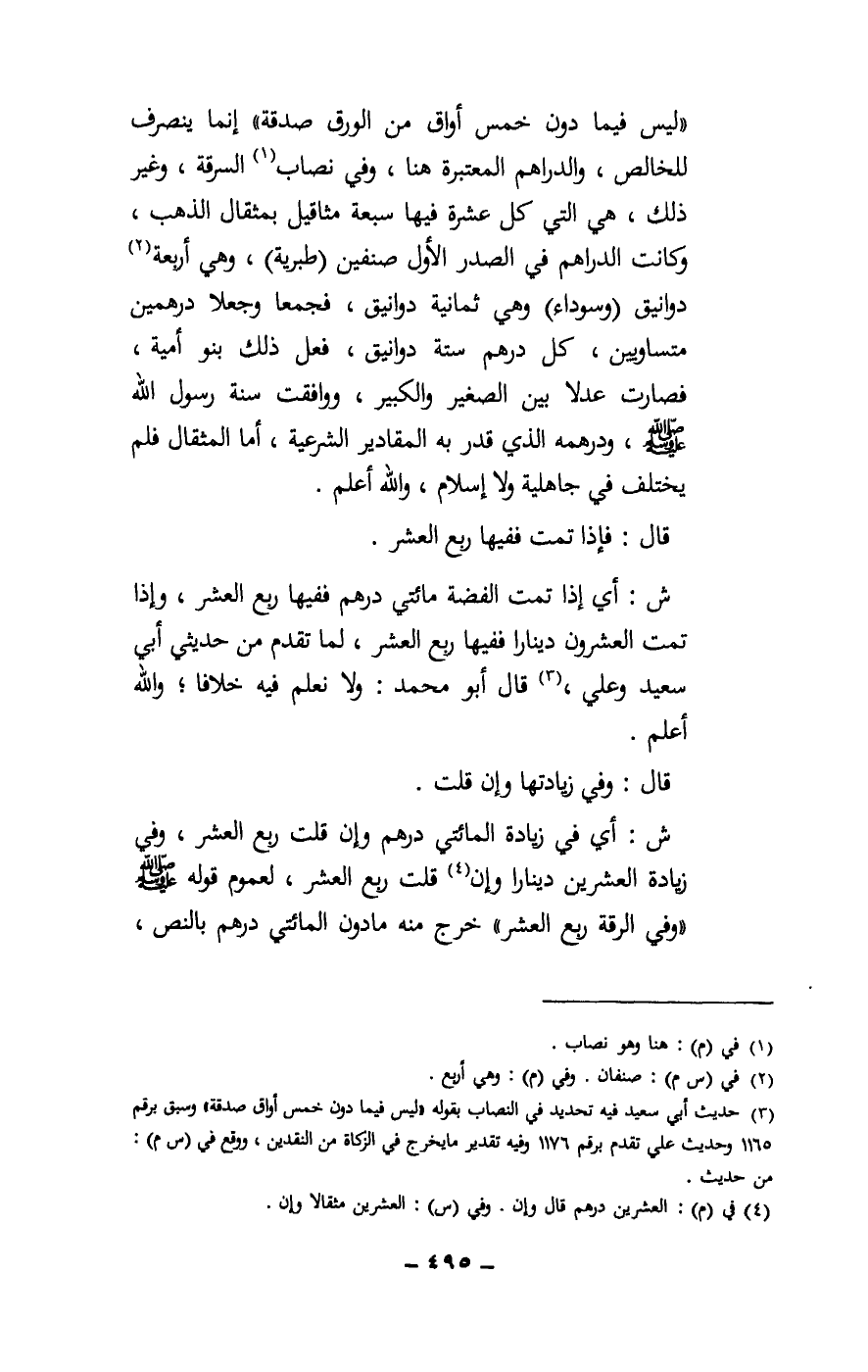 : «ليس فيما دون خمس أواق من الورق صدقة» إنما ينصرف للخالص، والدراهم المعتبرة هنا، وفي نصاب السرقة، وغير ذلك، هي التي كل عشرة فيها سبعة مثاقيل بمثقال الذهب، وكانت الدراهم في الصدر الأول صنفين (طبرية) ، وهي أربعة دوانيق (وسوداء) وهي ثمانية دوانيق، فجمعا وجعلا درهمين متساويين، كل درهم ستة دوانيق، فعل ذلك بنو أمية، فصارت عدلا بين الصغير والكبير، ووافقت سنة رسول الله - صَلَّى اللَّهُ عَلَيْهِ وَسَلَّمَ - ودرهمه الذي قدر به المقادير الشرعية، أما المثقال فلم يختلف في جاهلية ولا إسلام، والله أعلم.