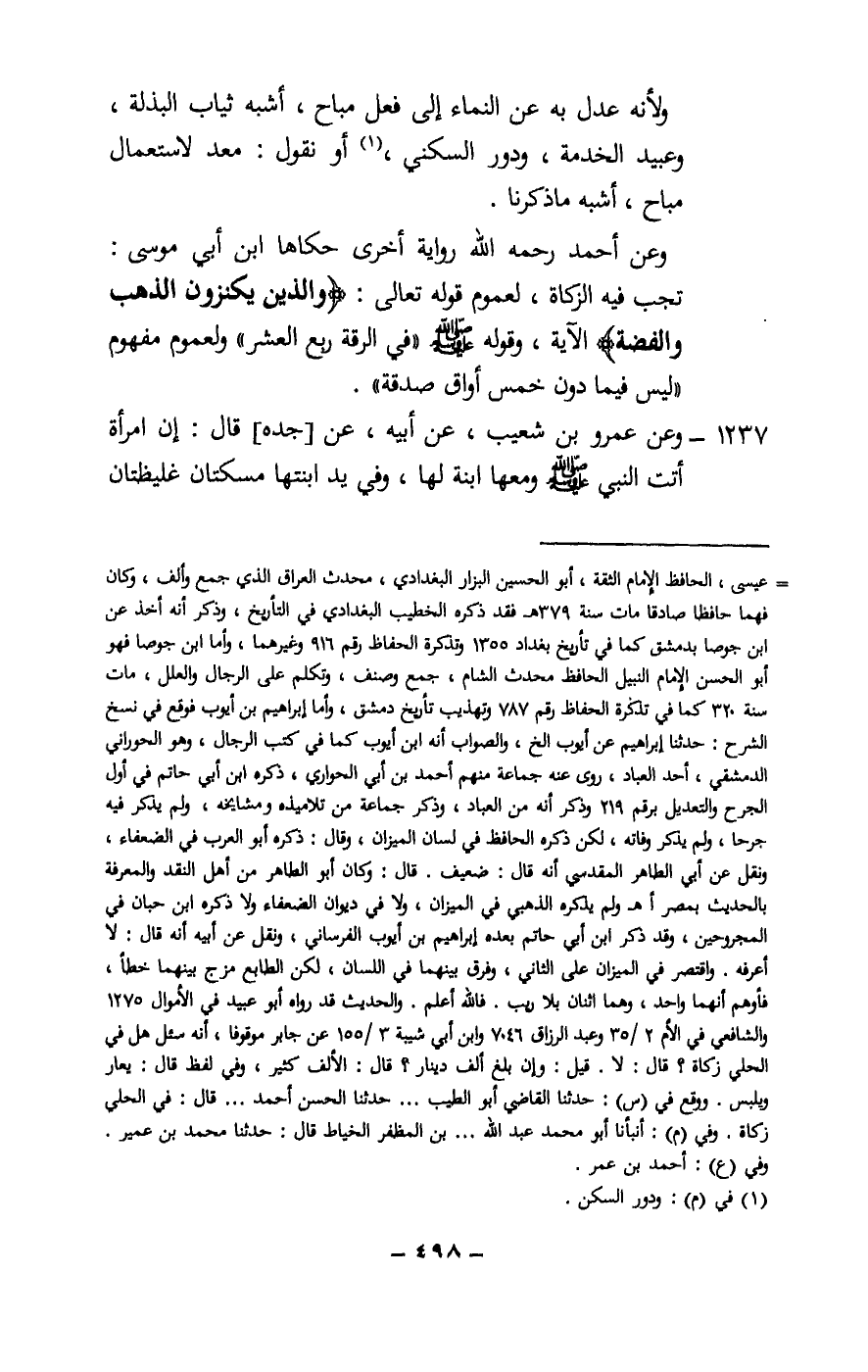 1237 - وعن عمرو بن شعيب، عن أبيه، عن [جده] قال: «إن امرأة أتت النبي - صَلَّى اللَّهُ عَلَيْهِ وَسَلَّمَ - ومعها ابنة لها، وفي يد ابنتها مسكتان غليظتان