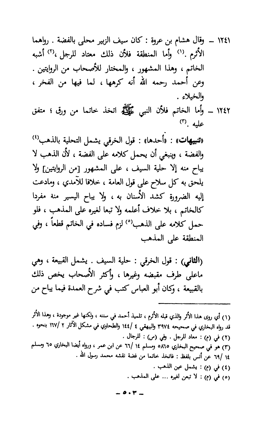 1241 - وقال هشام بن عروة: كان سيف الزبير محلى بالفضة. رواهما الأثرم. وأما المنطقة فلأن ذلك معتاد للرجل، أشبه الخاتم، وهذا المشهور، والمختار للأصحاب من الروايتين. وعن أحمد - رَحِمَهُ اللَّهُ - أنه كرهها، لما فيها من الفخر، والخيلاء.