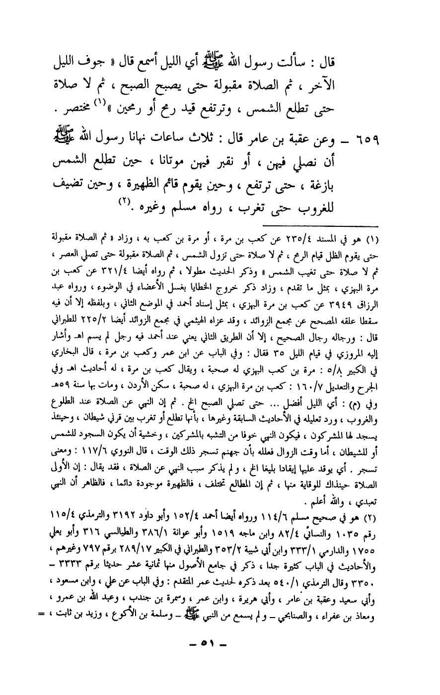 659 - «وعن عقبة بن عامر، قال: ثلاث ساعات نهانا رسول الله - صَلَّى اللَّهُ عَلَيْهِ وَسَلَّمَ - أن نصلي فيهن، أو نقبر فيهن موتانا، حين تطلع الشمس بازغة، حتى ترتفع، وحين يقوم قائم الظهيرة، وحين تضيف للغروب حتى تغرب» ، رواه مسلم وغيره.