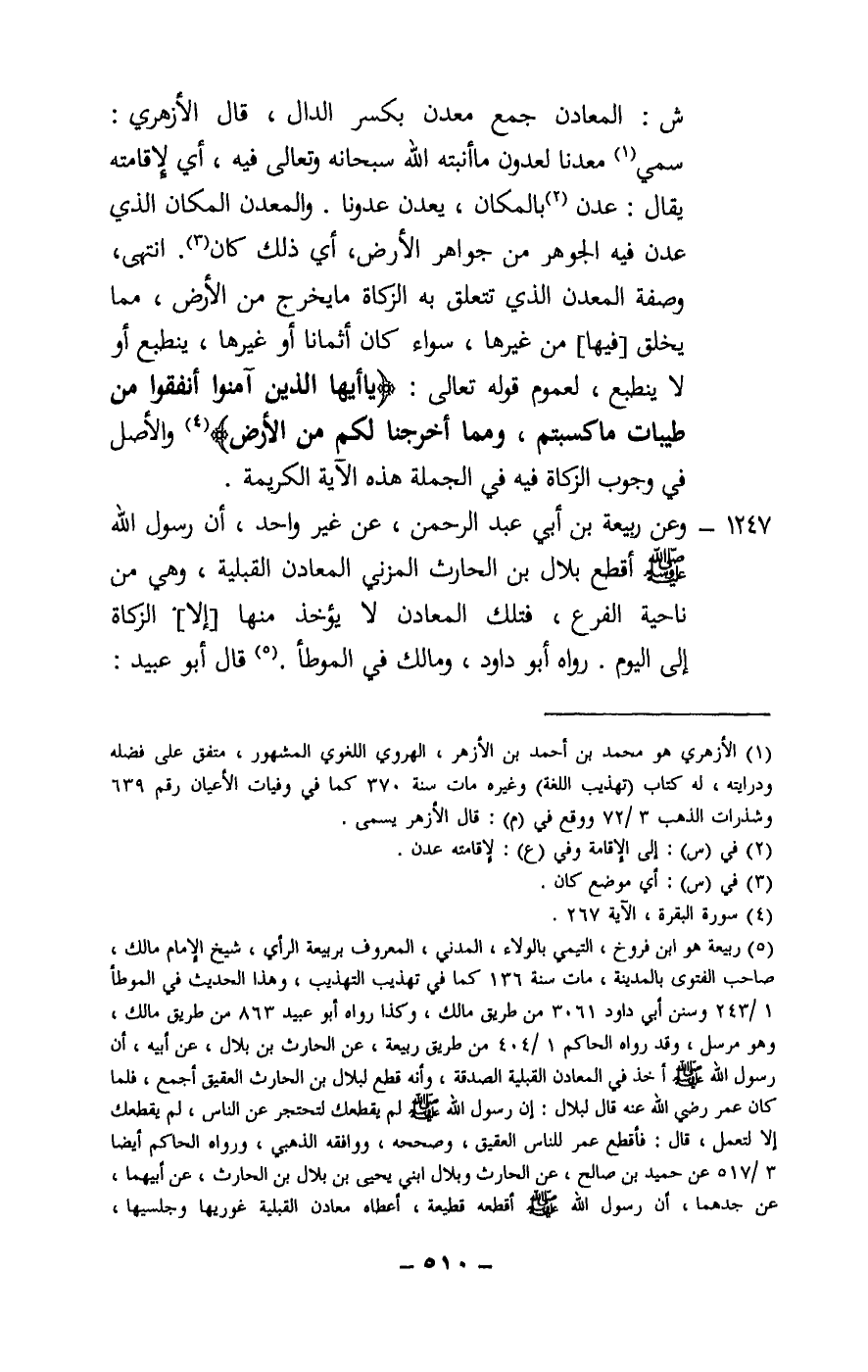 1247 - وعن ربيعة بن أبي عبد الرحمن، عن غير واحد، أن «رسول الله - صَلَّى اللَّهُ عَلَيْهِ وَسَلَّمَ - أقطع بلال بن الحارث المزني المعادن القبلية» ، وهي من ناحية الفرع، فتلك المعادن لا يؤخذ منها [إلا] الزكاة إلى اليوم. رواه أبو داود، ومالك في الموطأ. قال أبو عبيد: