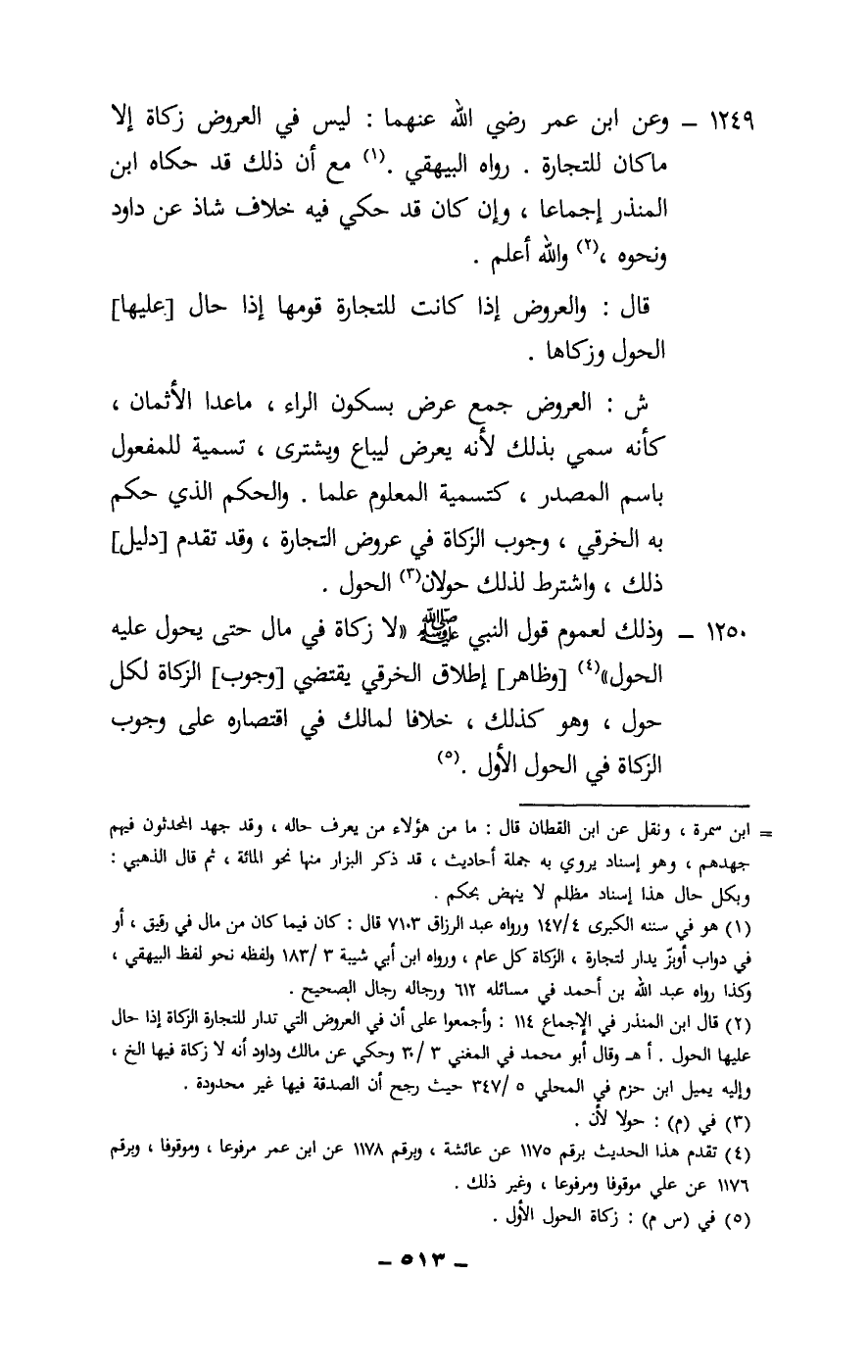 1250 - وذلك لعموم قول النبي - صَلَّى اللَّهُ عَلَيْهِ وَسَلَّمَ -: «لا زكاة في مال حتى يحول عليه الحول» [وظاهر] إطلاق الخرقي يقتضي [وجوب] الزكاة لكل حول، وهو كذلك، خلافا لمالك في اقتصاره على وجوب الزكاة في الحول الأول.