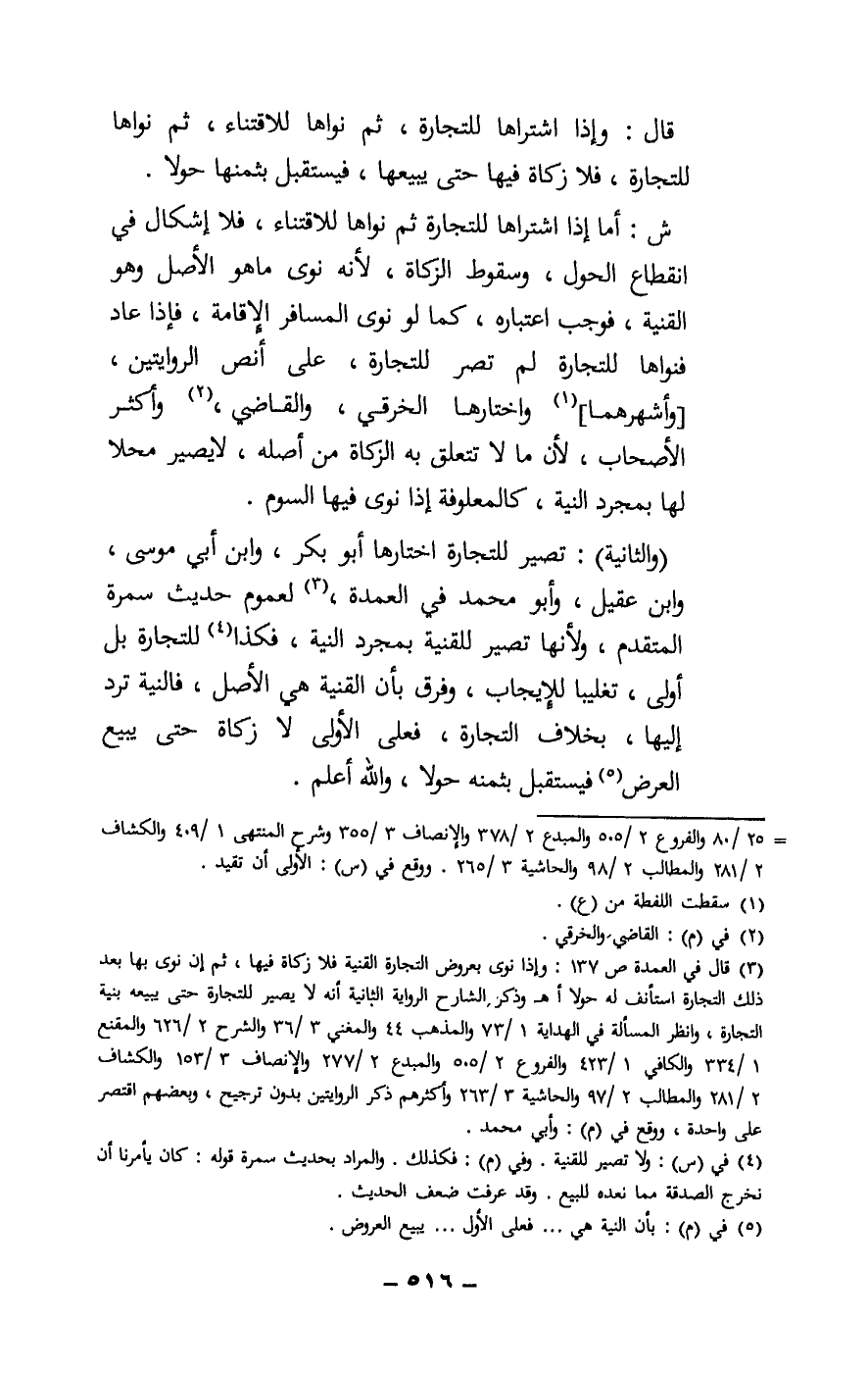 ش: أما إذا اشتراها للتجارة ثم نواها للاقتناء، فلا إشكال في انقطاع الحول، وسقوط الزكاة، لأنه نوى ما هو الأصل وهو القنية، فوجب اعتباره، كما لو نوى المسافر الإقامة، فإذا عاد فنواها للتجارة لم تصر للتجارة، على أنص الروايتين، [وأشهرهما] واختارها الخرقي، والقاضي، وأكثر الأصحاب، لأن ما لا تتعلق به الزكاة من أصله، لا يصير محلا لها بمجرد النية، كالمعلوفة إذا نوى فيها السوم.