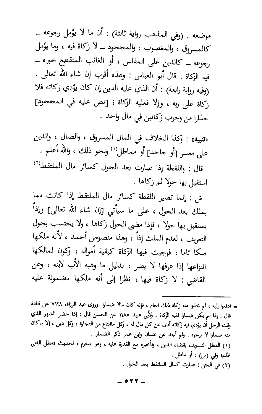 «تنبيه» : وكذا الخلاف في المال المسروق، والضال، والدين على معسر [أو جاحد] أو مماطل ونحو ذلك، والله أعلم.