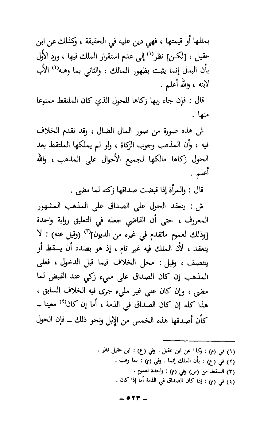 ش: ينعقد الحول على الصداق على المذهب المشهور المعروف، حتى أن القاضي جعله في التعليق رواية واحدة [وذلك لعموم ما تقدم في غيره من الديون] (وقيل عنه) : لا ينعقد، لأن الملك فيه غير تام، إذ هو بصدد أن يسقط أو يتنصف، وقيل: محل الخلاف فيما قبل الدخول، فعلى المذهب إن كان الصداق على مليء زكي عند القبض لما مضى، وإن كان على غير مليء جرى فيه الخلاف السابق، هذا كله إن كان الصداق في الذمة، أما إن كان معينا - كأن أصدقها هذه الخمس من الإبل ونحو ذلك - فإن الحول