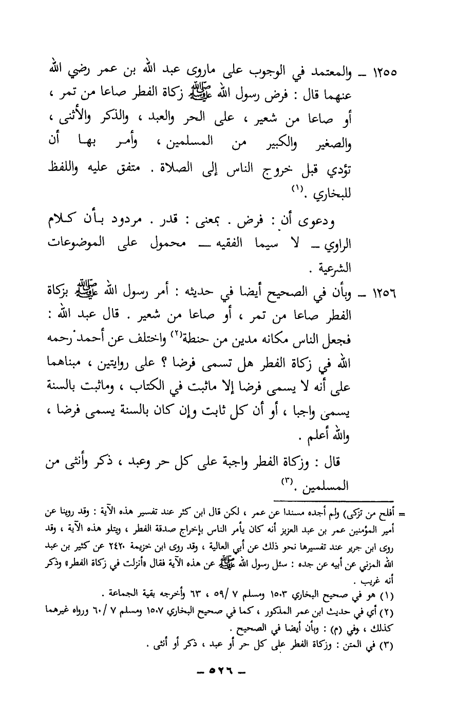 1255 - والمعتمد في الوجوب على ما روى عبد الله بن عمر - رَضِيَ اللَّهُ عَنْهُمَا - قال: «فرض رسول الله - صَلَّى اللَّهُ عَلَيْهِ وَسَلَّمَ - زكاة الفطر صاعا من تمر، أو صاعا من شعير، على الحر والعبد، والذكر والأنثى، والصغير والكبير من المسلمين، وأمر بها أن تؤدي قبل خروج الناس إلى الصلاة» . متفق عليه واللفظ للبخاري.