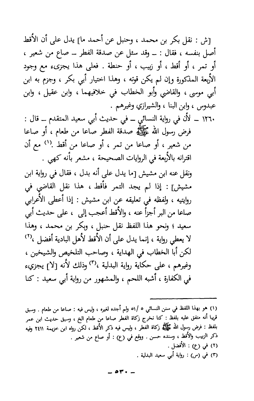 ونقل عنه ابن مشيش [ما يدل على أنه بدل، فقال في رواية ابن مشيش] : إذا لم يجد التمر فأقط، هذا نقل القاضي في روايتيه، ولفظه في تعليقه عن ابن مشيش: إذا أعطى الأعرابي صاعا من البر أجزأ عنه، والأقط أعجب إلي، على حديث أبي سعيد؛ ونحو هذا اللفظ نقل حنبل، وبكر بن محمد، وهذا لا يعطي رواية، إنما يدل على أن الأقط لأهل البادية أفضل، لكن أبا الخطاب في الهداية، وصاحب التلخيص والشيخين، وغيرهم، على حكاية رواية البدلية، وذلك لأنه [لا] يجزئ في الكفارة، أشبه اللحم، والمشهور من رواية أبي سعيد: كنا
