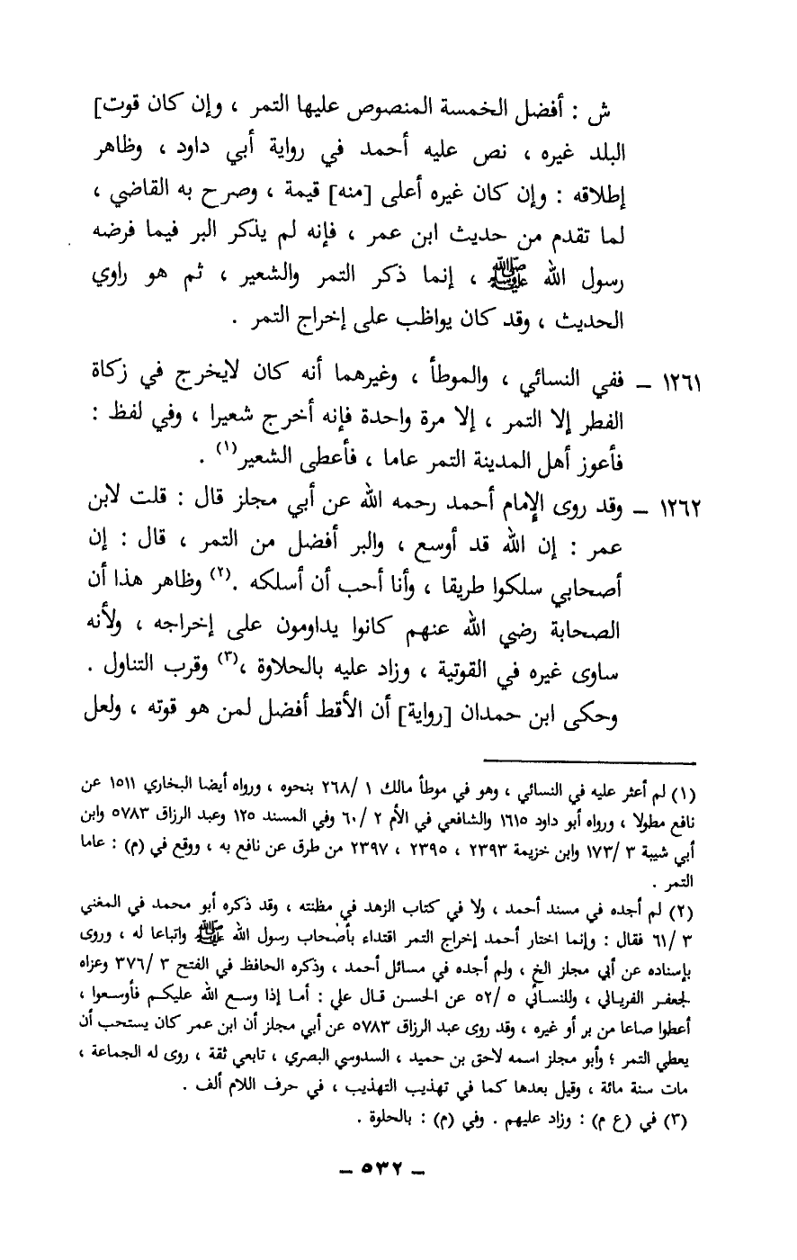 1262 - وقد روى الإمام أحمد - رَحِمَهُ اللَّهُ - عن أبي مجلز قال: قلت لابن عمر: إن الله قد أوسع، والبر أفضل من التمر، قال: إن أصحابي سلكوا طريقا، وأنا أحب أن أسلكه. وظاهر هذا أن الصحابة - رَضِيَ اللَّهُ عَنْهُمْ - كانوا يداومون على إخراجه، ولأنه ساوى غيره في القوتية، وزاد عليه بالحلاوة، وقرب التناول. وحكى ابن حمدان [رواية] أن الأقط أفضل لمن هو قوته، ولعل