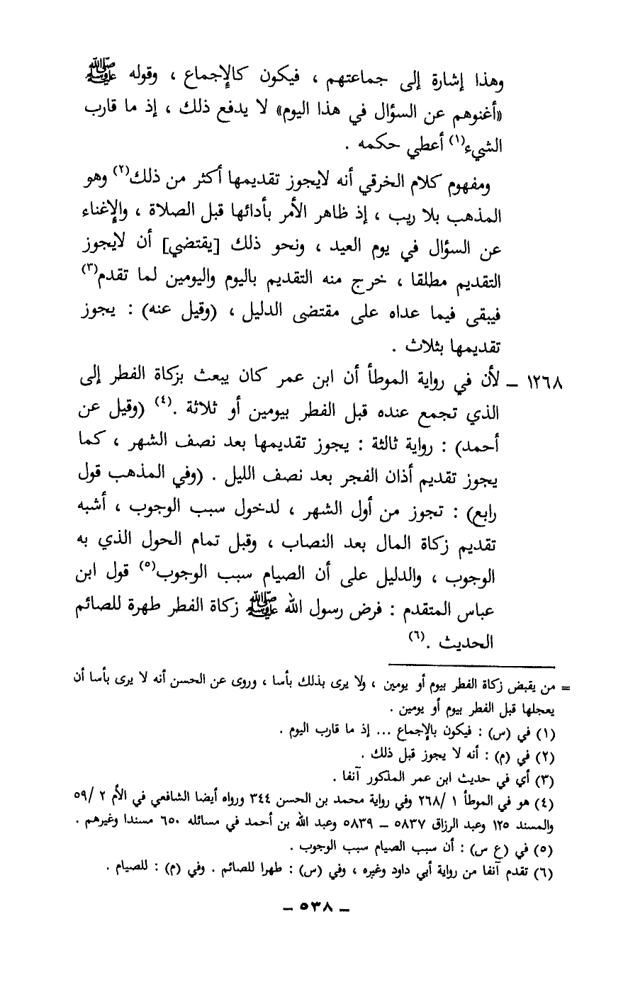 1268 - لأن في رواية الموطأ أن ابن عمر كان يبعث بزكاة الفطر إلى الذي تجمع عنده قبل الفطر بيومين أو ثلاثة. (وقيل عن أحمد) : رواية ثالثة: يجوز تقديمها بعد نصف الشهر، كما يجوز تقديم أذان الفجر بعد نصف الليل. (وفي المذهب قول رابع) : تجوز من أول الشهر، لدخول سبب الوجوب، أشبه تقديم زكاة المال بعد النصاب، وقبل تمام الحول الذي به الوجوب، والدليل على أن الصيام سبب الوجوب قول ابن عباس المتقدم: «فرض رسول الله - صَلَّى اللَّهُ عَلَيْهِ وَسَلَّمَ - زكاة الفطر طهرة للصائم» الحديث.