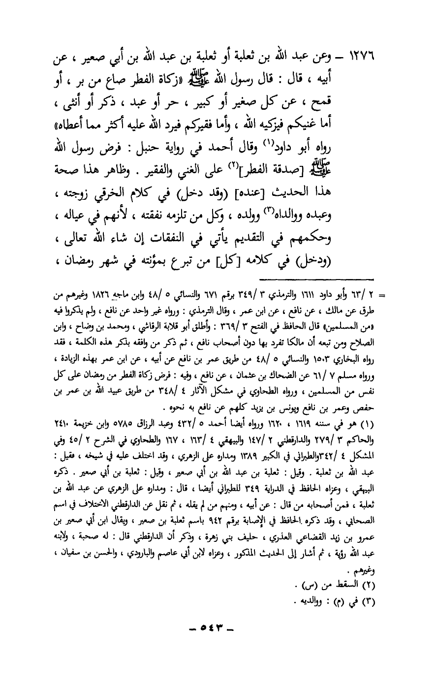 1276 - وعن عبد الله بن ثعلبة أو ثعلبة بن عبد الله بن أبي صعير، عن أبيه، قال: قال رسول الله - صَلَّى اللَّهُ عَلَيْهِ وَسَلَّمَ -: «زكاة الفطر صاع من بر، أو قمح، عن كل صغير أو كبير، حر أو عبد، ذكر أو أنثى، أما غنيكم فيزكيه الله، وأما فقيركم فيرد الله عليه أكثر مما أعطاه» رواه أبو داود، وقال أحمد في رواية حنبل: «فرض رسول الله - صَلَّى اللَّهُ عَلَيْهِ وَسَلَّمَ -: [صدقة الفطر] على الغني والفقير» . وظاهر هذا صحة هذا الحديث [عنده] (وقد دخل) في كلام الخرقي زوجته، وعبده ووالداه وولده، وكل من تلزمه نفقته، لأنهم في عياله، وحكمهم في التقديم يأتي في النفقات إن شاء الله تعالى، (ودخل) في كلامه [كل] من تبرع بمؤنته في شهر رمضان،