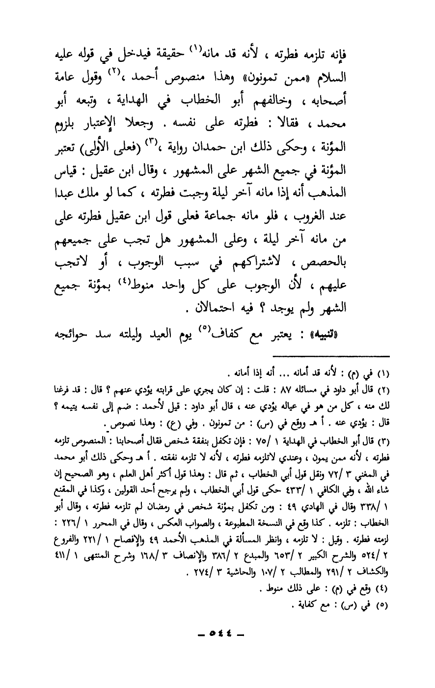 فإنه تلزمه فطرته، لأنه قد مانه حقيقة فيدخل في قوله - عَلَيْهِ السَّلَامُ -: «ممن تمونون» وهذا منصوص أحمد، وقول عامة أصحابه، وخالفهم أبو الخطاب في الهداية، وتبعه أبو محمد، فقالا: فطرته على نفسه. وجعلا الاعتبار بلزوم المؤنة، وحكى ذلك ابن حمدان رواية، (فعلى الأولى) تعتبر المؤنة في جميع الشهر على المشهور، وقال ابن عقيل: قياس المذهب أنه إذا مانه آخر ليلة وجبت فطرته، كما لو ملك عبدا عند الغروب، فلو مانه جماعة فعلى قول ابن عقيل فطرته على من مانه آخر ليلة، وعلى المشهور هل تجب على جميعهم بالحصص، لاشتراكهم في سبب الوجوب، أو لا تجب عليهم، لأن الوجوب على كل واحد منوط بمؤنة جميع الشهر ولم يوجد؟ فيه احتمالان.