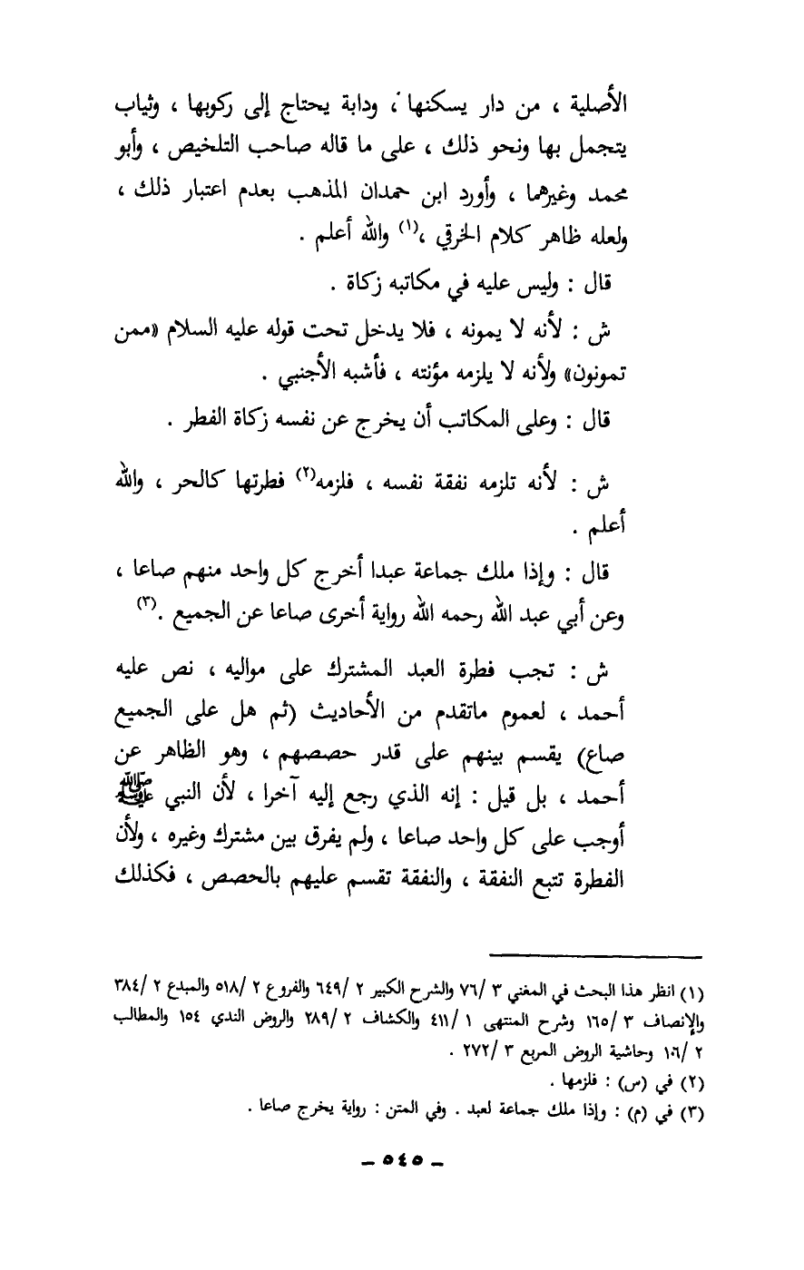 ش: تجب فطرة العبد المشترك على مواليه، نص عليه أحمد، لعموم ما تقدم من الأحاديث (ثم هل على الجميع صاع) يقسم بينهم على قدر حصصهم، وهو الظاهر عن أحمد، بل قيل: إنه الذي رجع إليه آخرا، لأن النبي - صَلَّى اللَّهُ عَلَيْهِ وَسَلَّمَ - أوجب على كل واحد صاعا، ولم يفرق بين مشترك وغيره، ولأن الفطرة تتبع النفقة، والنفقة تقسم عليهم بالحصص، فكذلك