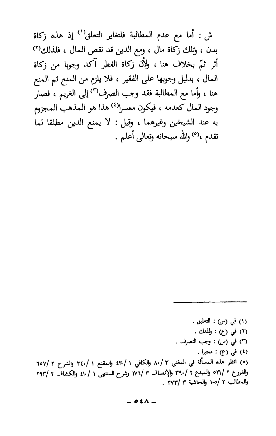 ش: أما مع عدم المطالبة فلتغاير التعلق إذ هذه زكاة بدن، وتلك زكاة مال، ومع الدين قد نقص المال، فلذلك أثر ثم بخلاف هنا، ولأن زكاة الفطر آكد وجوبا من زكاة المال، بدليل وجوبها على الفقير، فلا يلزم من المنع ثم المنع هنا، وأما مع المطالبة فقد وجب الصرف إلى الغريم، فصار وجود المال كعدمه، فيكون معسرا، هذا هو المذهب المجزوم به عند الشيخين وغيرهما، وقيل: لا يمنع الدين مطلقا لما تقدم، والله سبحانه وتعالى أعلم.