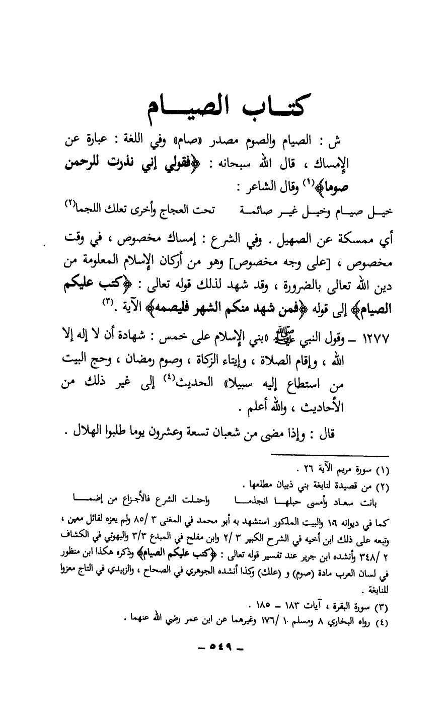 ش: الصيام والصوم مصدر «صام» وفي اللغة: عبارة عن الإمساك، قال الله سبحانه: {فَقُولِي إِنِّي نَذَرْتُ لِلرَّحْمَنِ صَوْمًا} [مريم: 26] وقال الشاعر: