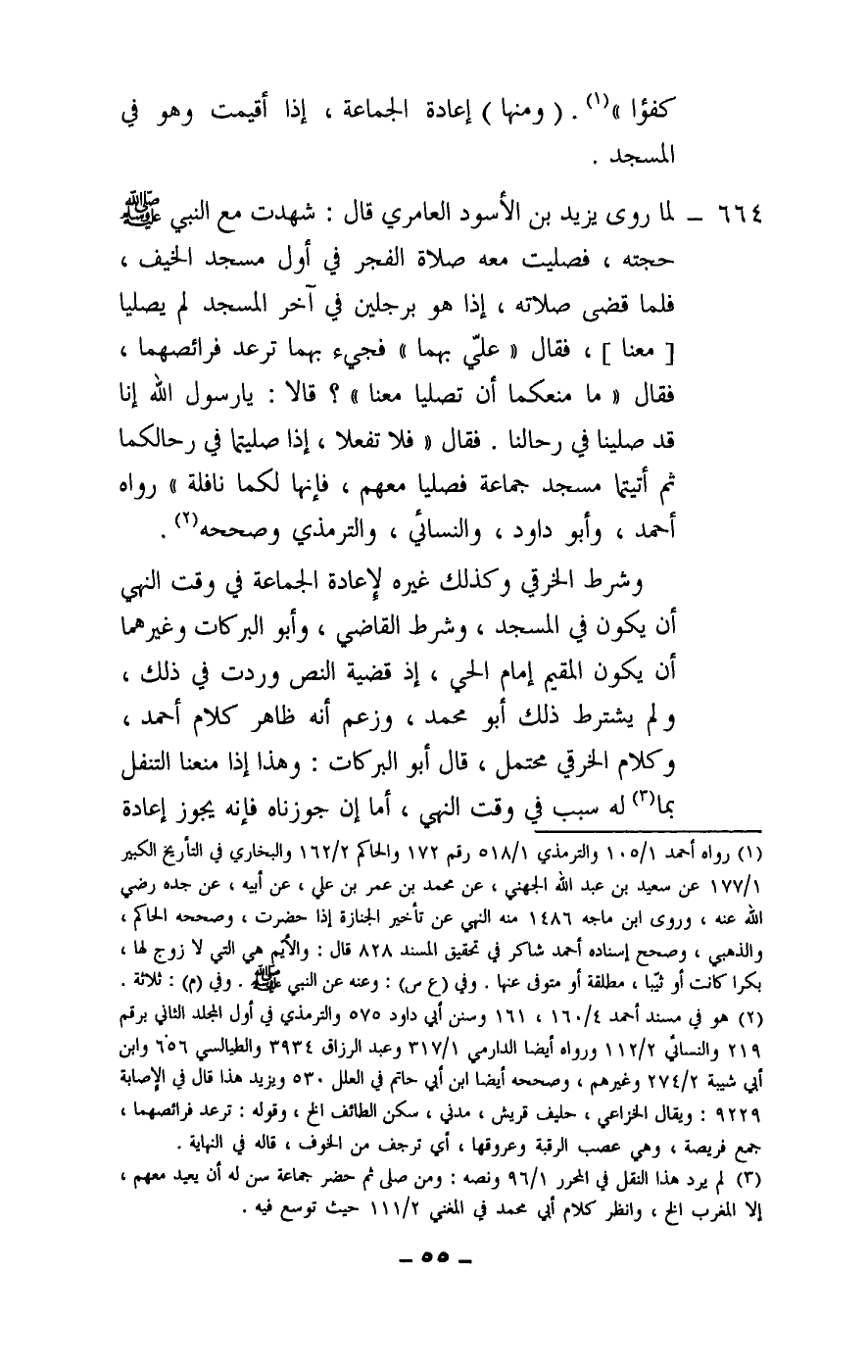 664 - لما «روى يزيد بن الأسود العامري، قال: شهدت مع النبي - صَلَّى اللَّهُ عَلَيْهِ وَسَلَّمَ - حجته، فصليت معه صلاة الفجر في أول مسجد الخيف، فلما قضى صلاته، إذا هو برجلين في آخر المسجد لم يصليا [معنا] ، فقال: «علي بهما» فجيء بهما ترعد فرائصهما، فقال: «ما منعكما أن تصليا معنا» ؟ قالا: يا رسول الله إنا قد صلينا في رحالنا. فقال: «فلا تفعلا، إذا صليتما في رحالكما ثم أتيتما مسجد جماعة فصليا معهم، فإنها لكما نافلة» رواه أحمد، وأبو داود، والنسائي، والترمذي وصححه.