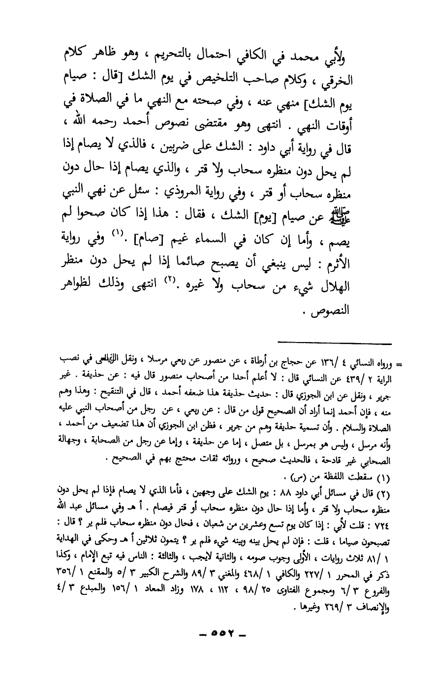 ولأبي محمد في الكافي احتمال بالتحريم، وهو ظاهر كلام الخرقي، وكلام صاحب التلخيص في يوم الشك [قال: صيام يوم الشك] منهي عنه، وفي صحته مع النهي ما في الصلاة في أوقات النهي. انتهى وهو مقتضى نصوص أحمد - رَحِمَهُ اللَّهُ - قال في رواية أبي داود: الشك على ضربين، فالذي لا يصام إذا لم يحل دون منظره سحاب ولا قتر، والذي يصام إذا حال دون منظره سحاب أو قتر، وفي رواية المروذي: سئل عن نهي النبي - صَلَّى اللَّهُ عَلَيْهِ وَسَلَّمَ - عن صيام [يوم] الشك، فقال: هذا إذا كان صحوا لم يصم، وأما إن كان في السماء غيم [صام] . وفي رواية الأثرم: ليس ينبغي أن يصبح صائما إذا لم يحل دون منظر الهلال شيء من سحاب ولا غيره. انتهى وذلك لظواهر النصوص.